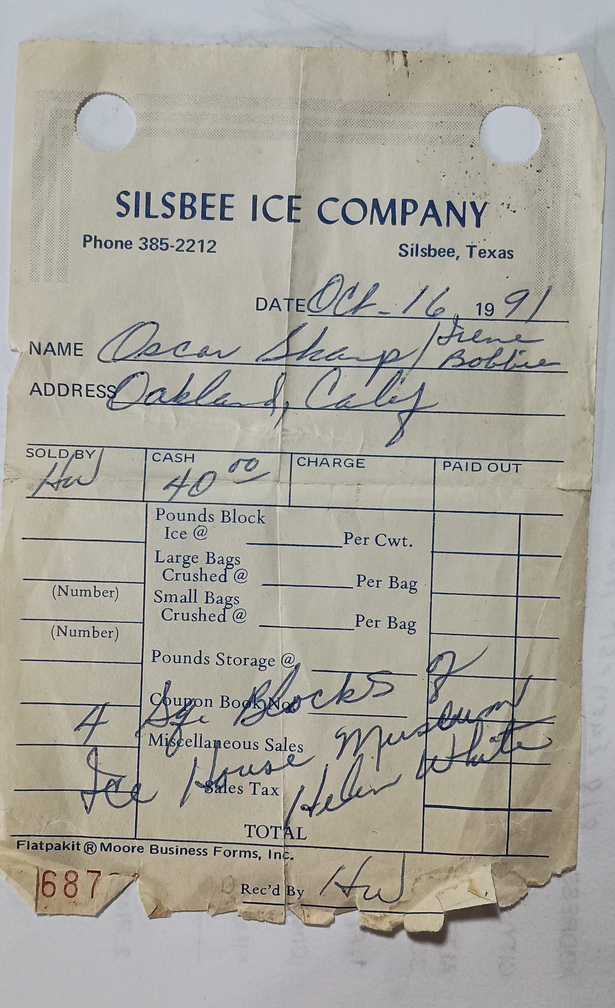 Original receipt printed with Silsbee Ice Company to Oscar Sharp/Irene Bobbie dated October 16, 1991Tags