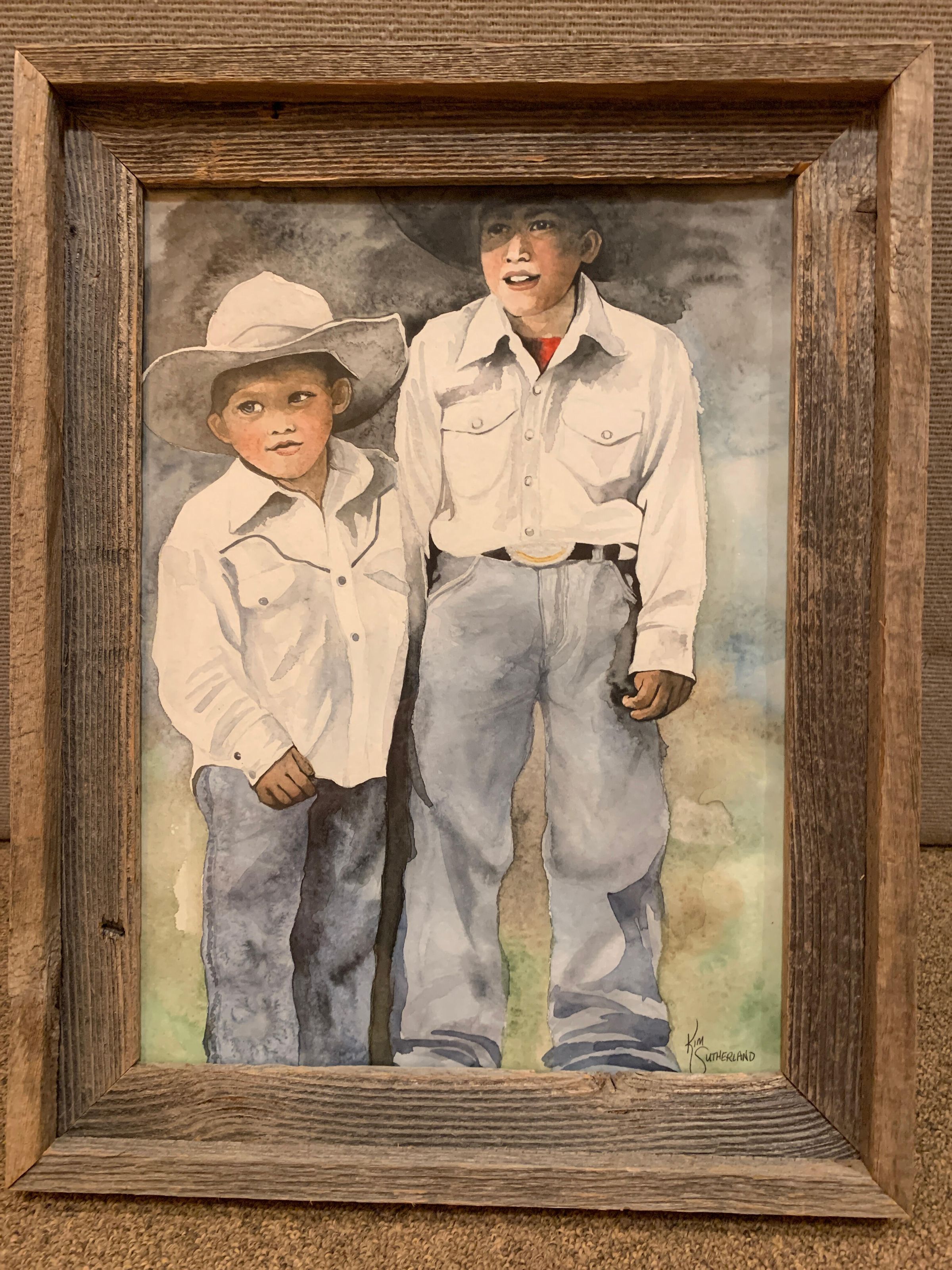 Two little boys, one tall, one short, wearing blue jeans, white western shirts and cowboy hatsType of Painting