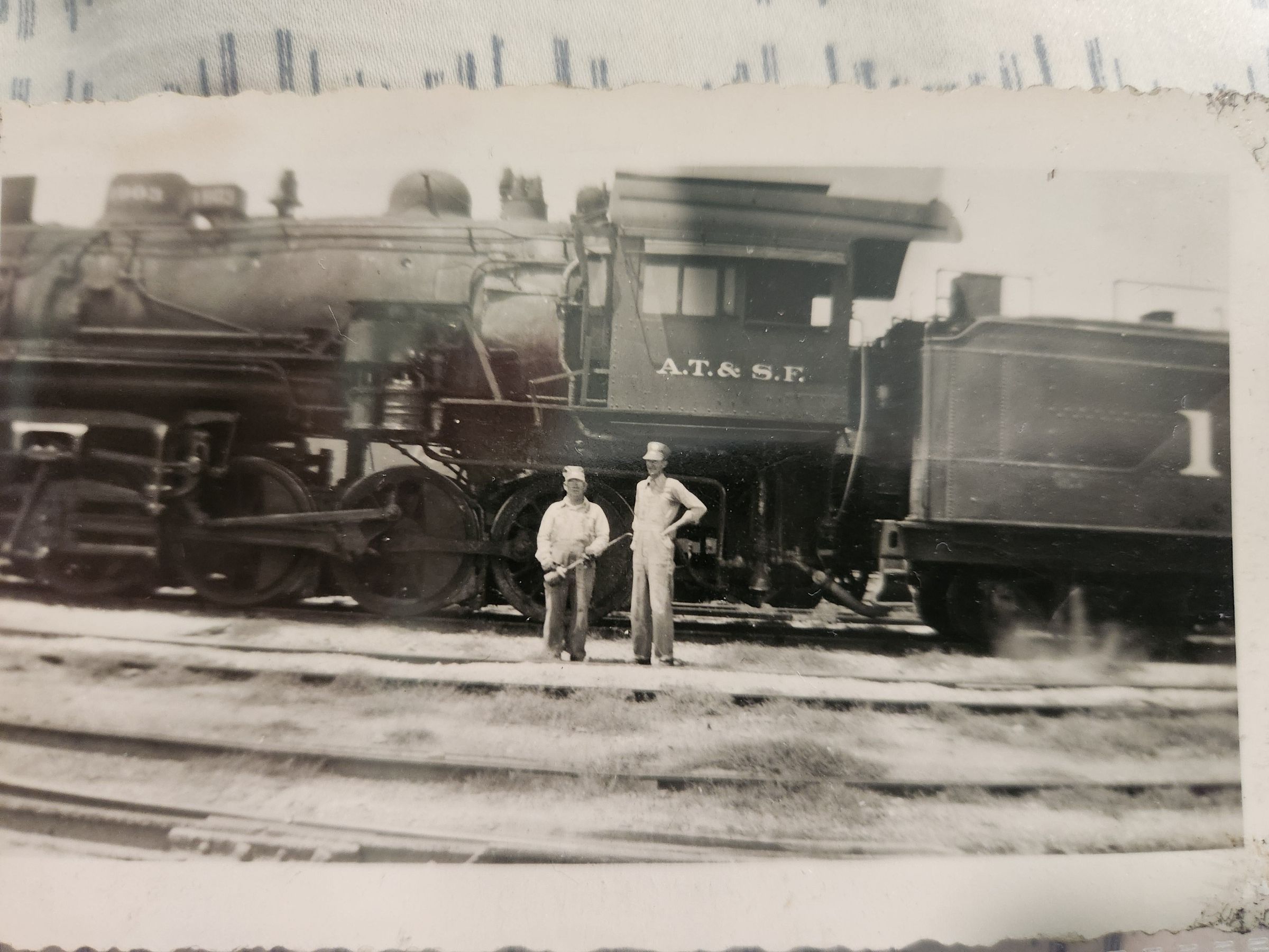 Photo of AT & SF Steam Engine with Workers C D Brown and Doug Wilson, Fireman