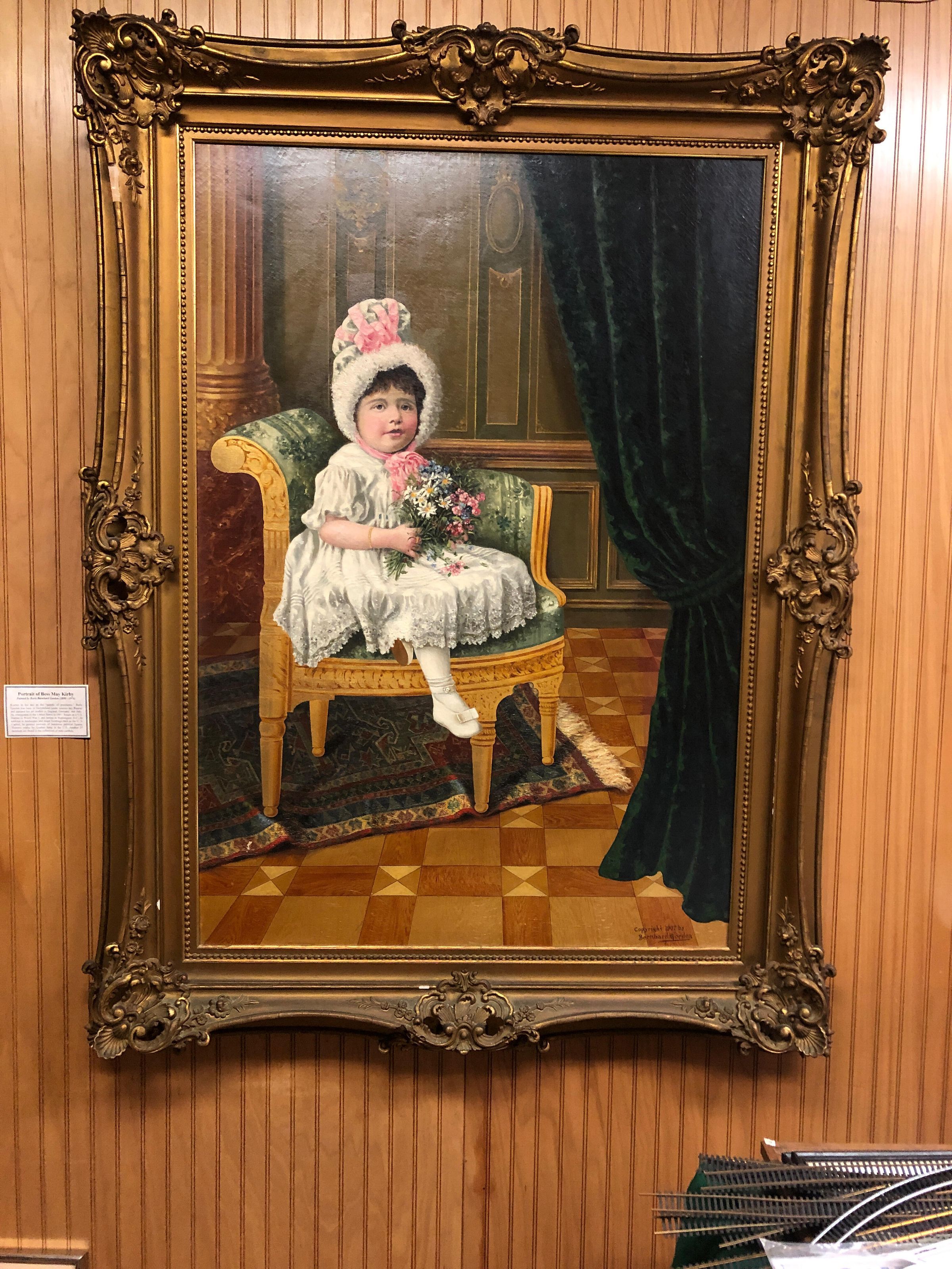 Bess May Kirby as a small child. Bess is sitting in a chair , holding flowers, legs crossed, white and pink dress, hat, and shoes.Artwork Details