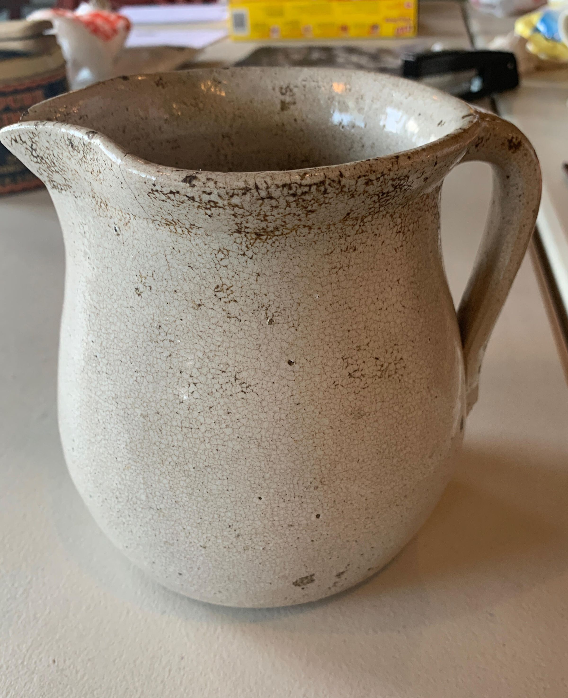 White crackle effect, big chip on spout, lots of nicksCollection