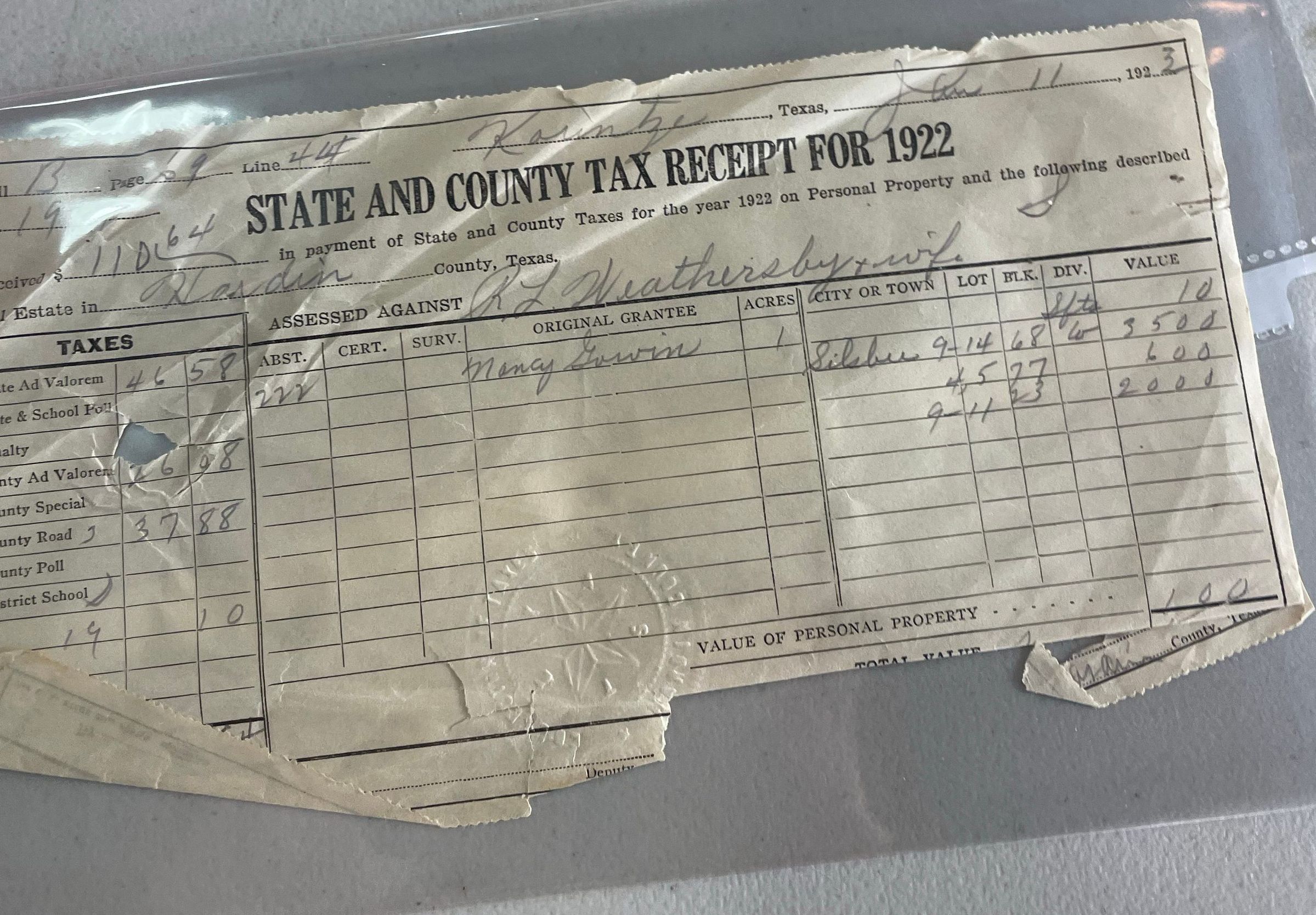Receipt for Payment of R L Weathersby and wife State and County Taxes 1922Tags
