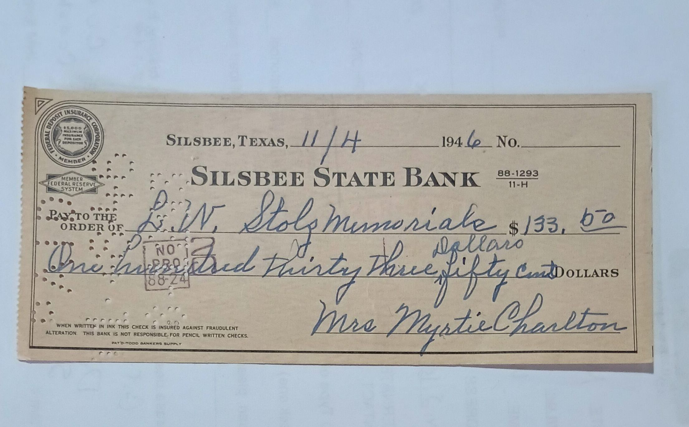 Receipt for Silsbee State Bank to the order of L. W. Stols Memoriale for $133.50 dated November 4, 1946 from Mrs Myrtie CharltonTags