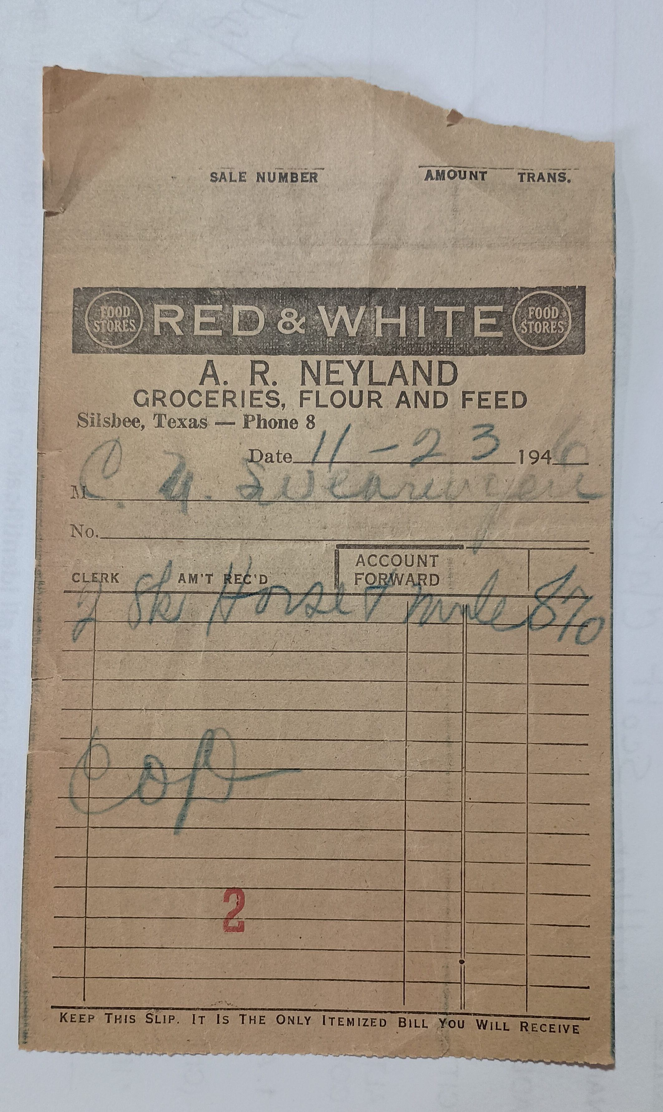 Receipt from AR Neyland - Goceries, Flour and Feed -dated November 2,1946 to C.W. Swearingen - "horse and mule"Tags