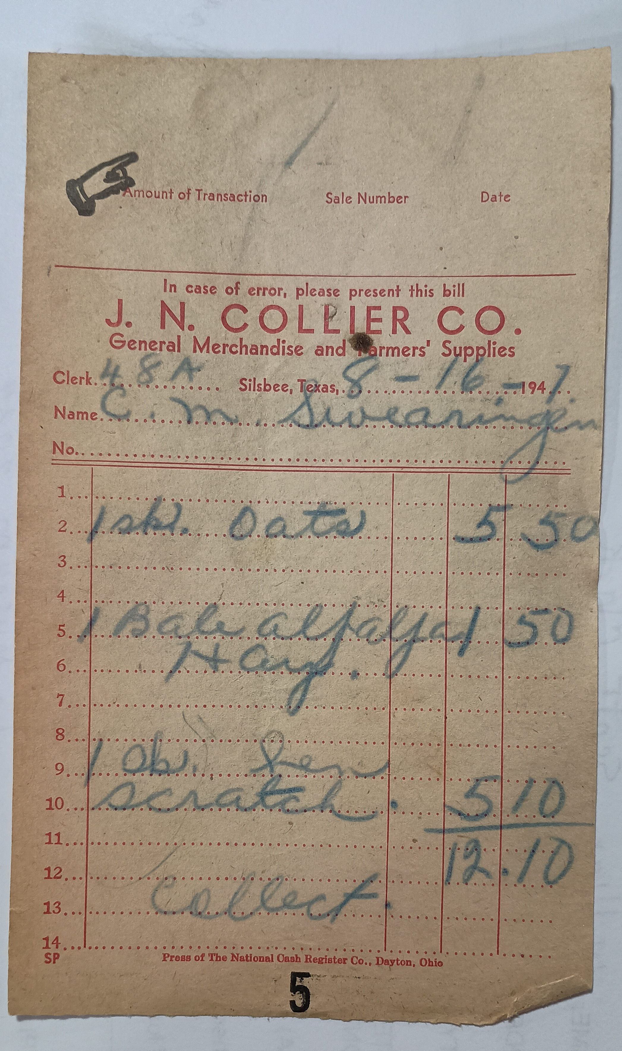 Receipt from J. N. Collier Co. - General Merchandise and Farmers' Supplies dated August 16, 1947 for oats, bale alfalfa/hay and hen scratchTags