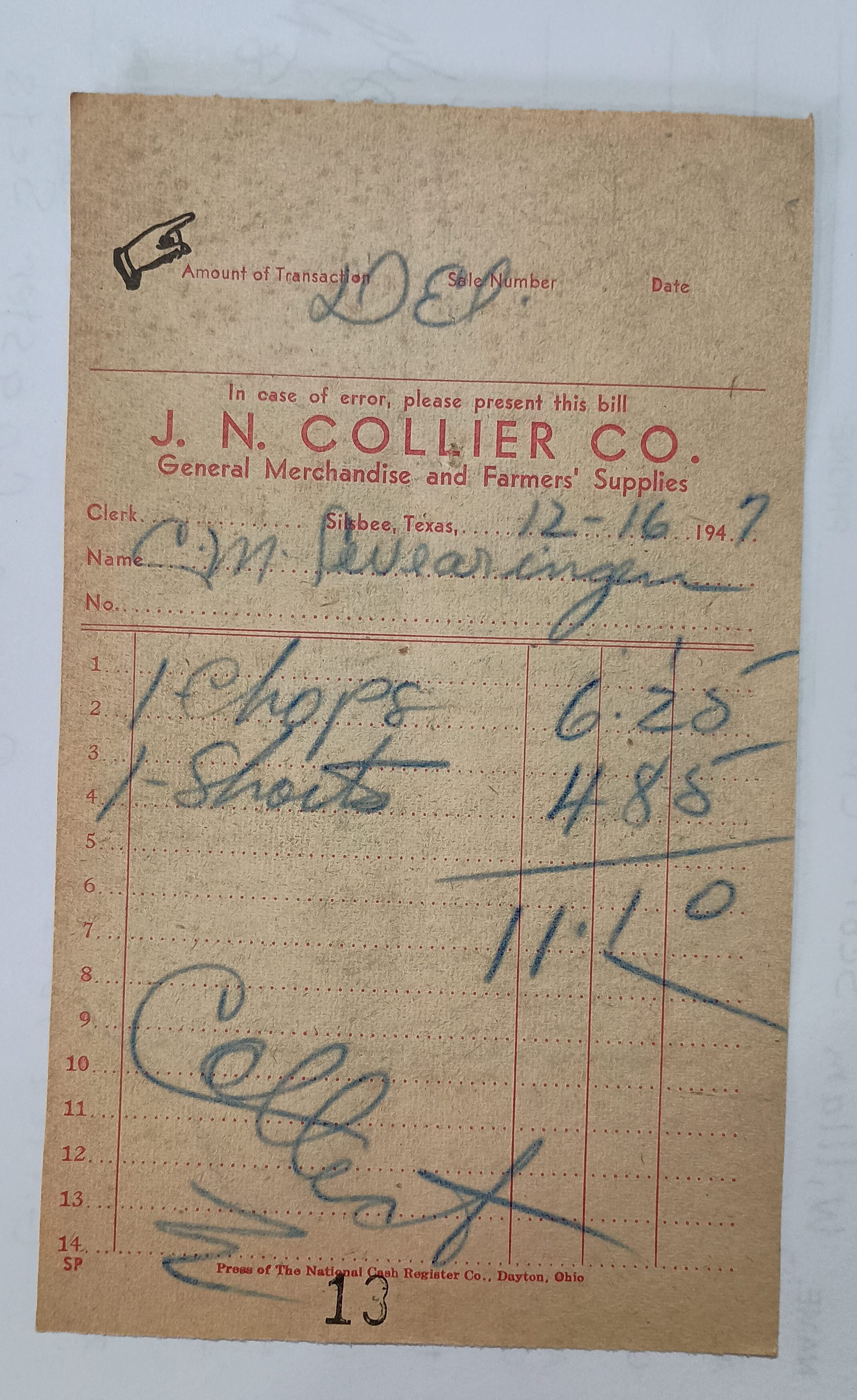 Receipt from J. N. Collier Co. - General Merchandise and Farmers' Supplies dated December 16, 1947 for chops and shortsTags