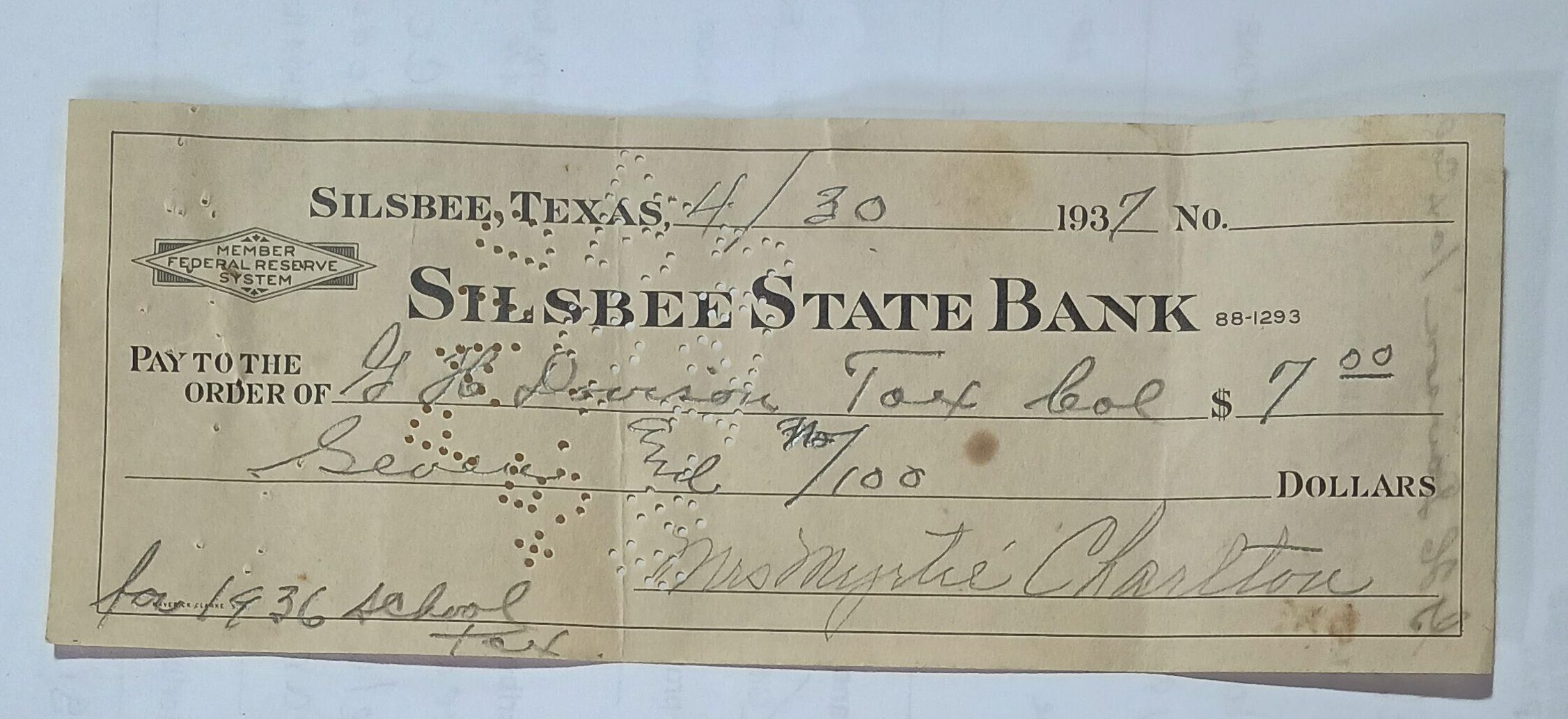 Receipt from Silsbee State Bank dated April 30, 1937 to G. H. Davison Tax Collector for $7.00 from Mrs Myrtie Charlton for 1936 school taxTags