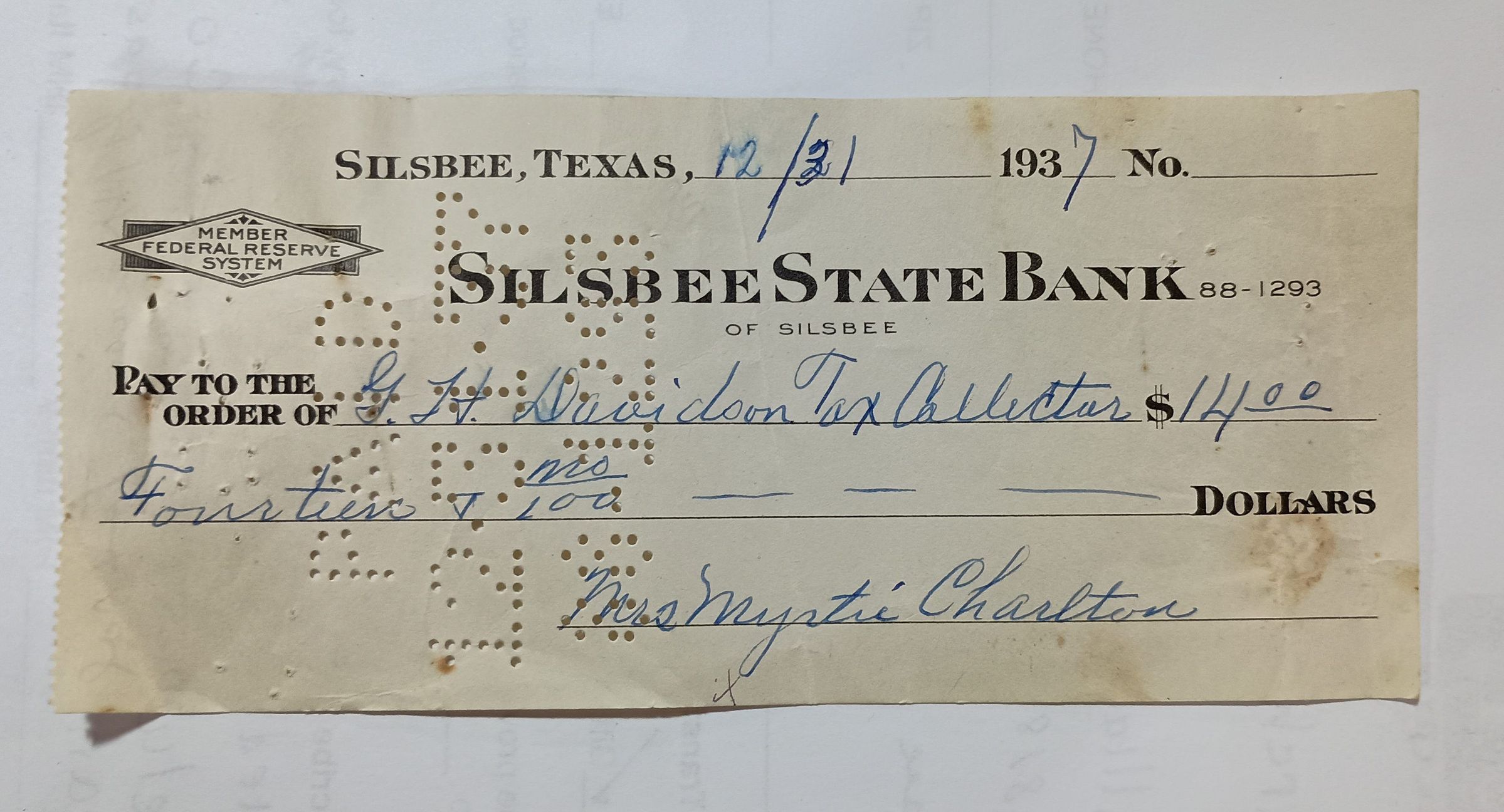 Receipt from Silsbee State Bank dated December 31, 1937 - Pay to the order of G. H. Davidson, Tax Collector for $14.00 from Mrs Myrtie CharltonTags