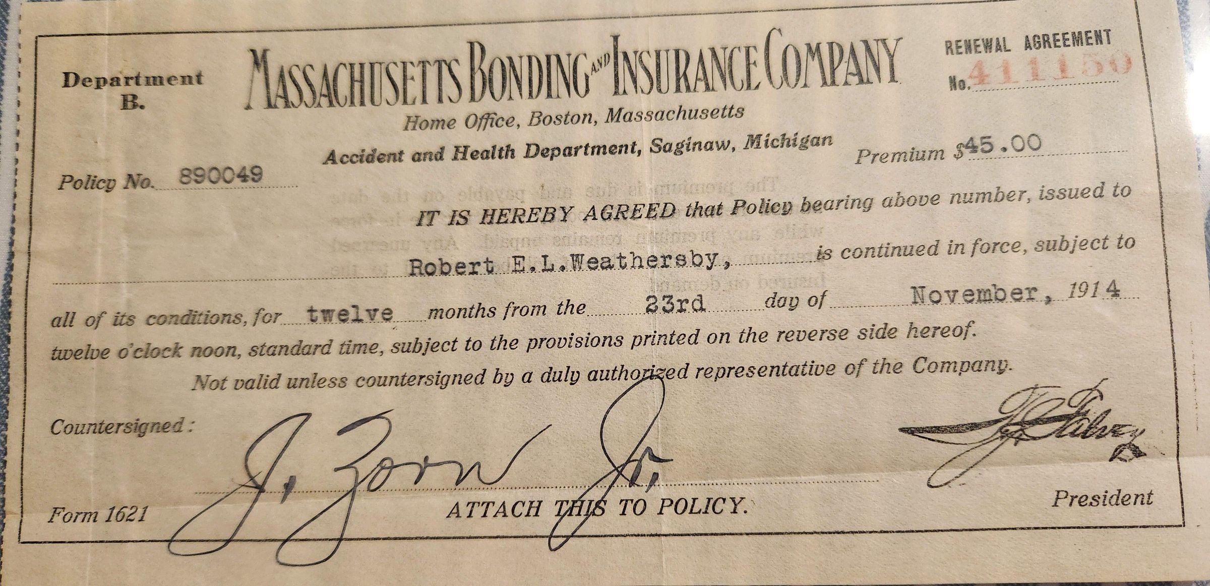 Renewal Agreement for Policy 890049 from Mass Bonding & Insurance Co to R L Weathersby dated November 23, 1914Tags