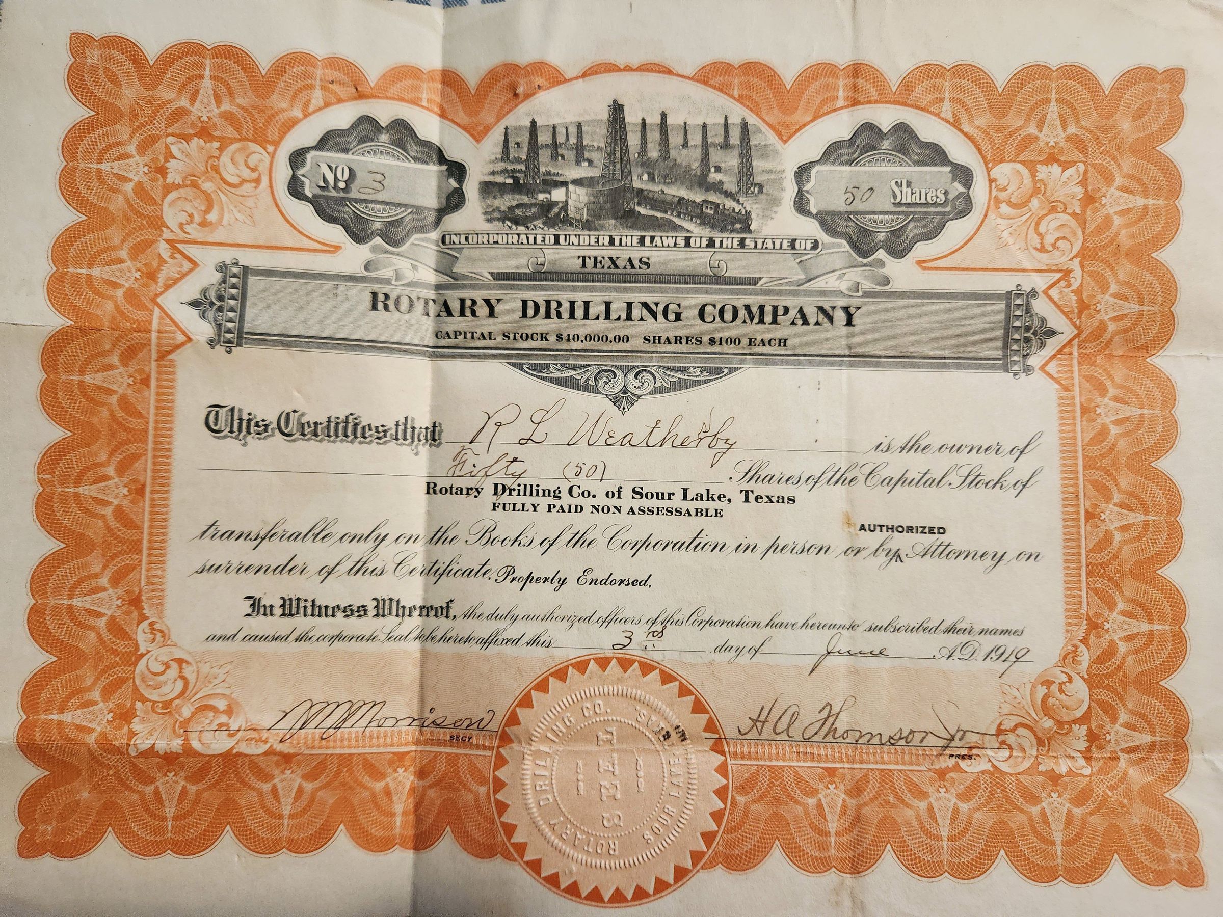 Rotary Drilling Company Capital Stock issued to R L Weathersby dated June 3, 1919Tags