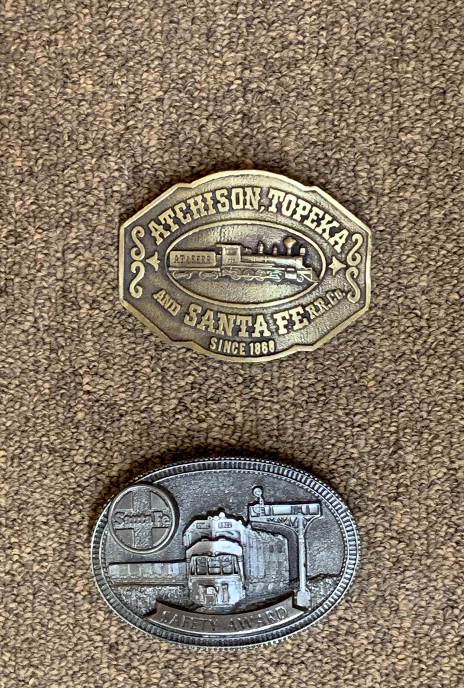 Two belt buckles with the logos of Atchison, Topeka, and Santa Fe R.R. Co, since 1868.Use