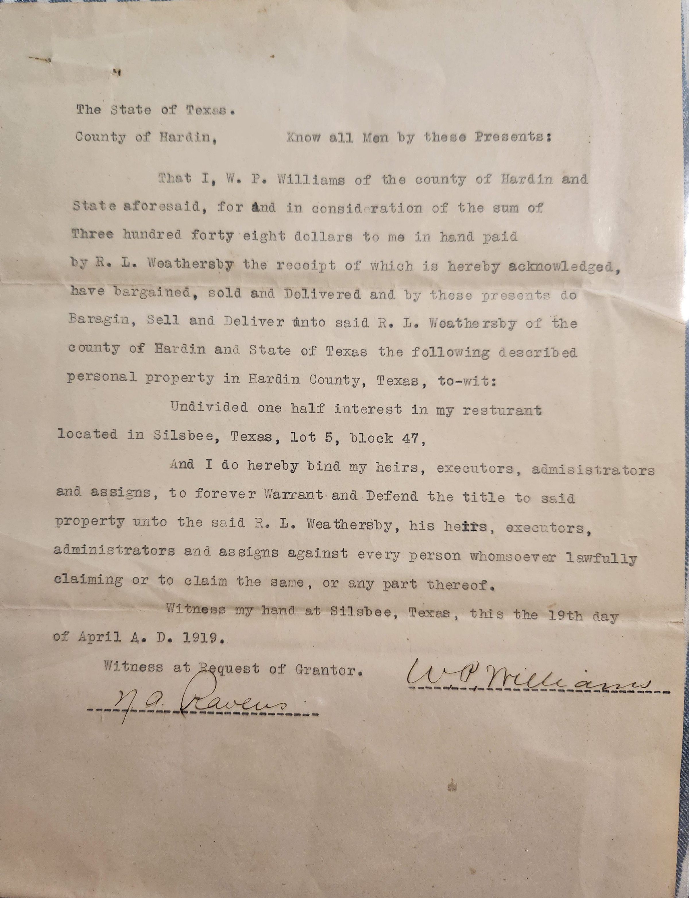Sale of One Half Interest in Resturant by W P Williams to R L Weathersby dated April 19, 1919Tags