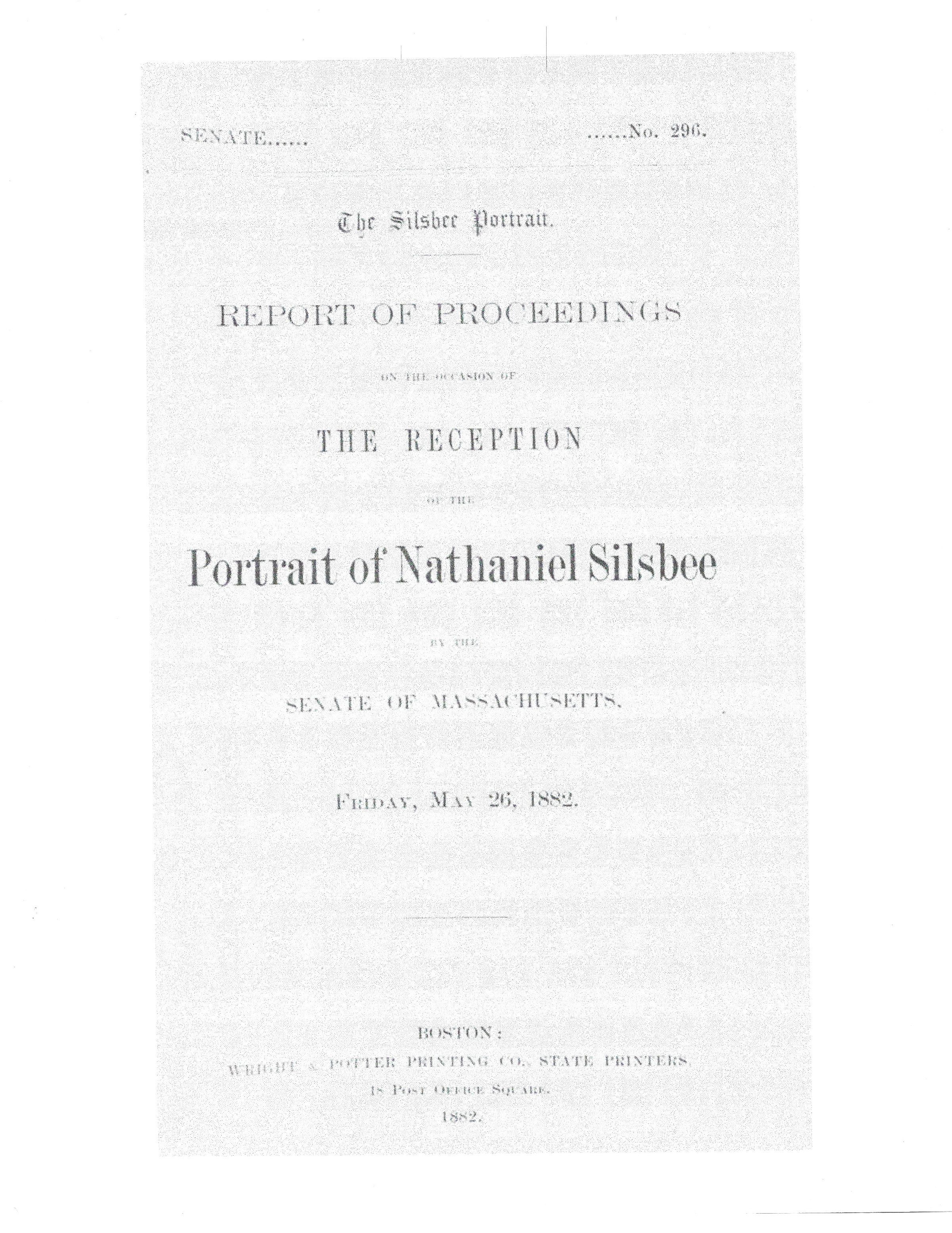 Senate Report of Proceedings on the Recption of the Portrait of Nathaniel Silsbee, State of Massachusetts dated May 26, 1882Created By