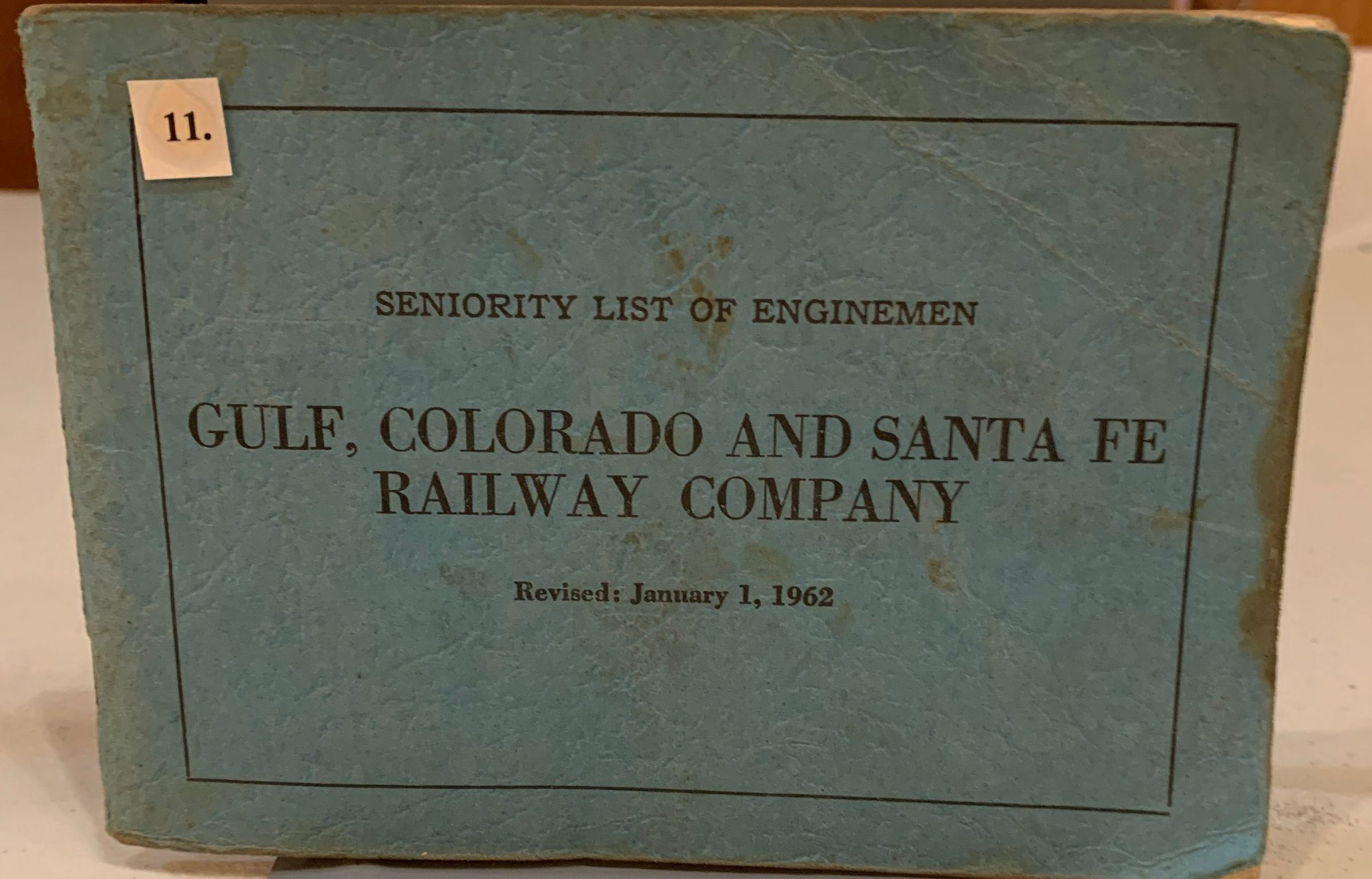 Small, blue book, stapled together, containing lists of Enginemen and their seniorityCollection