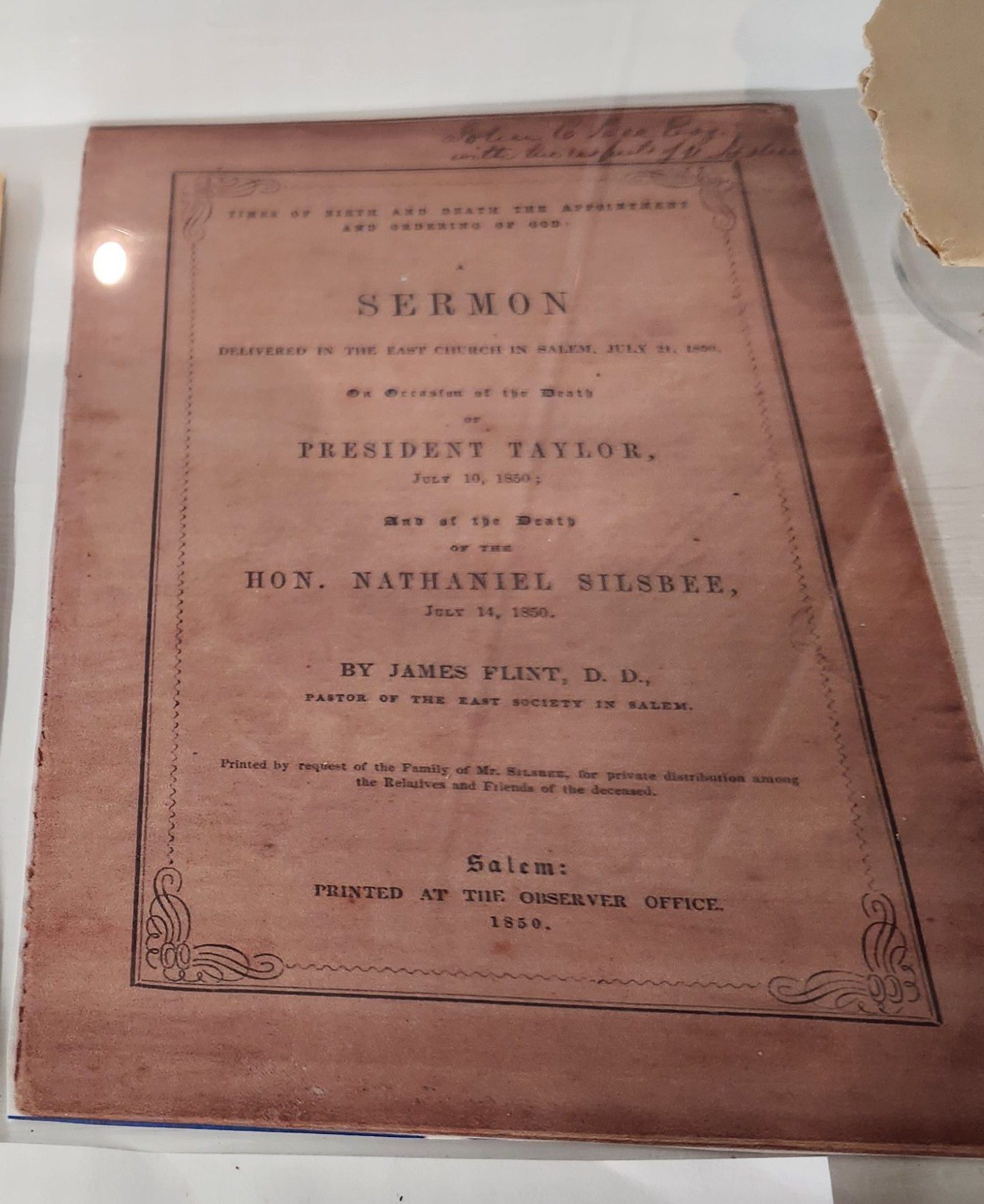 Dedicated to the Dealth of President Taylor on July 10, 1850 and Nathaniel Silsbee on July 14,1850. Sermon delivered by James Flint, DD, Pastor of the East Society in Salem, Mass. Nathaniel Silsbee was the Father of Nathaniel Silsbee that Silsbee, Texas was named for.Exhibition