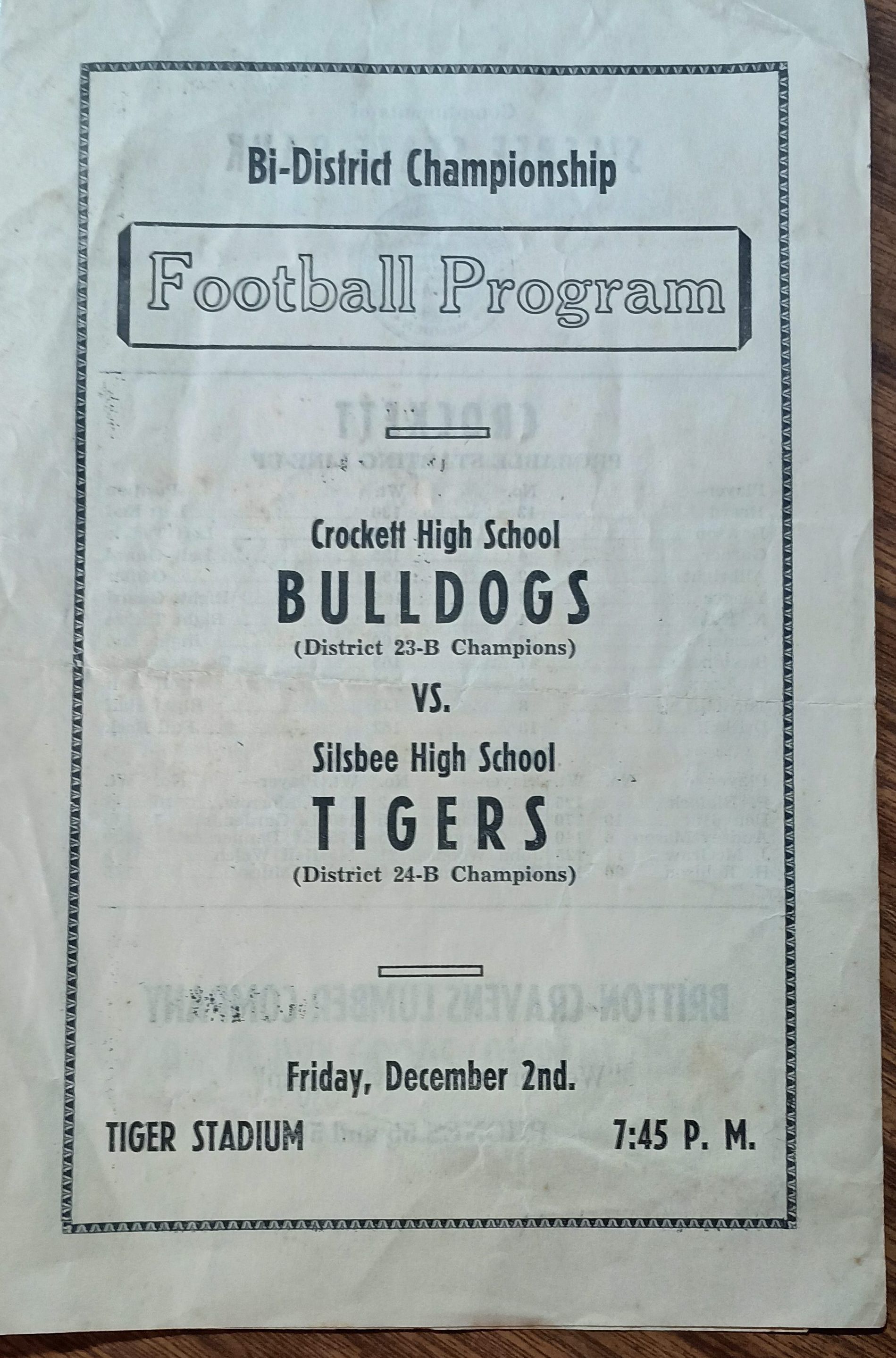 Silsbee High School Football Program dated December 2, year unknown - Crockett High School Bulldogs vs Silsbee High School TigersTags