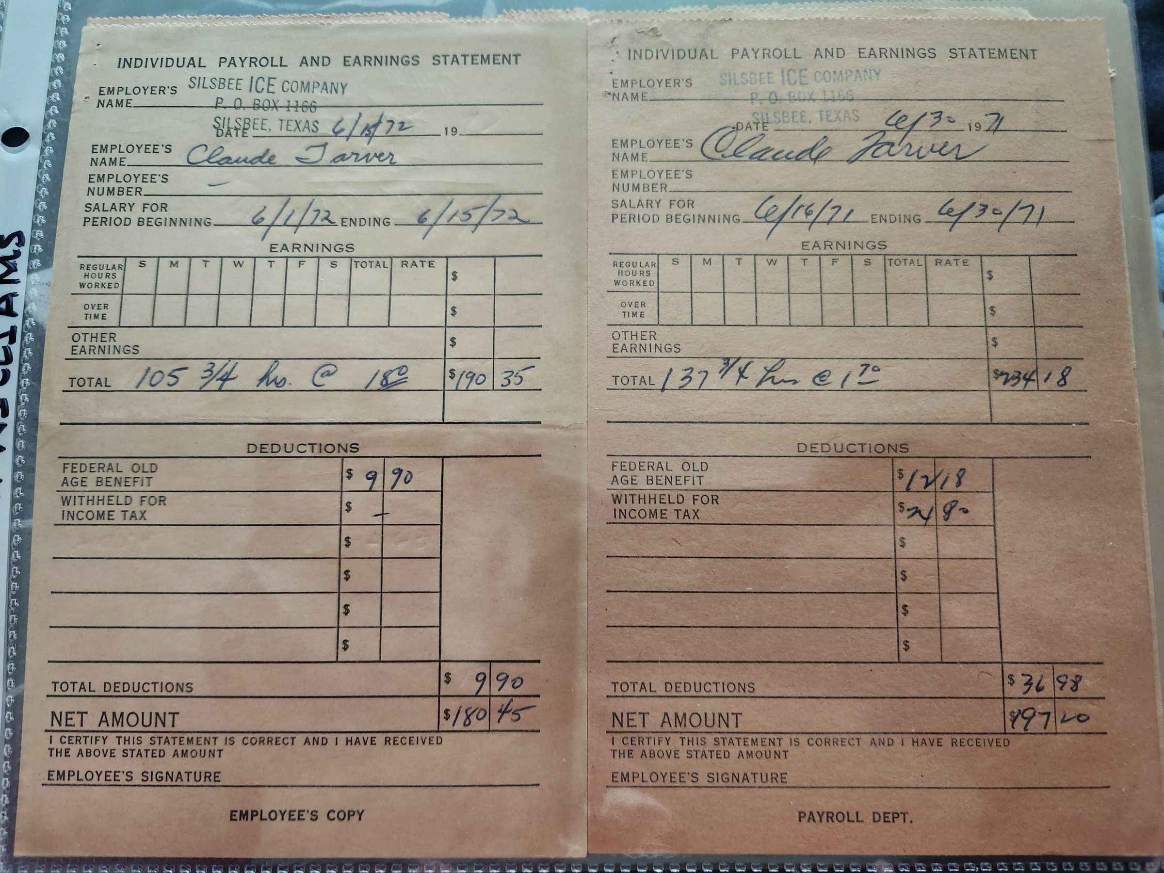 Silsbee Ice Company Payroll Stubs for Claude TarverTags