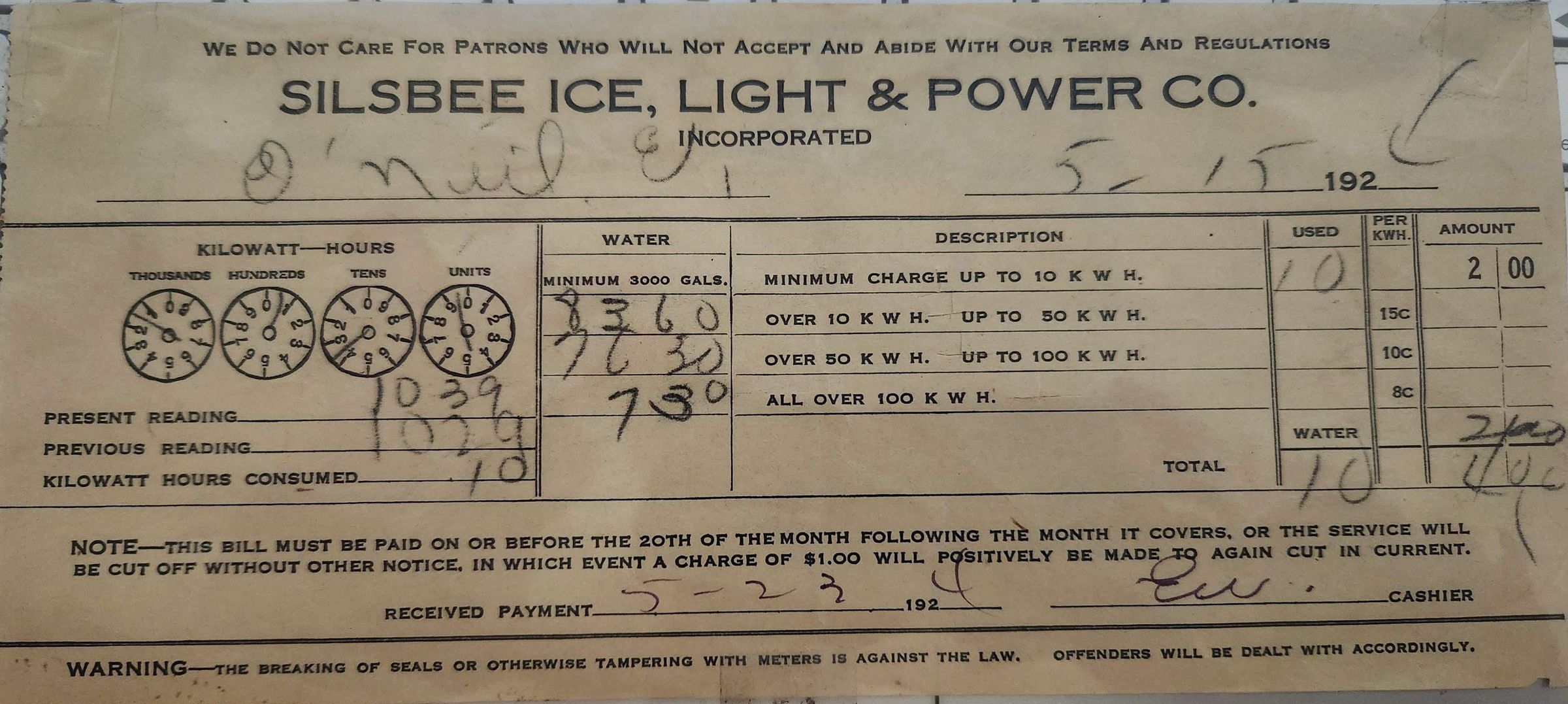 Silsbee Ice, Light & Power Co Billing dated May 15, 1924Tags