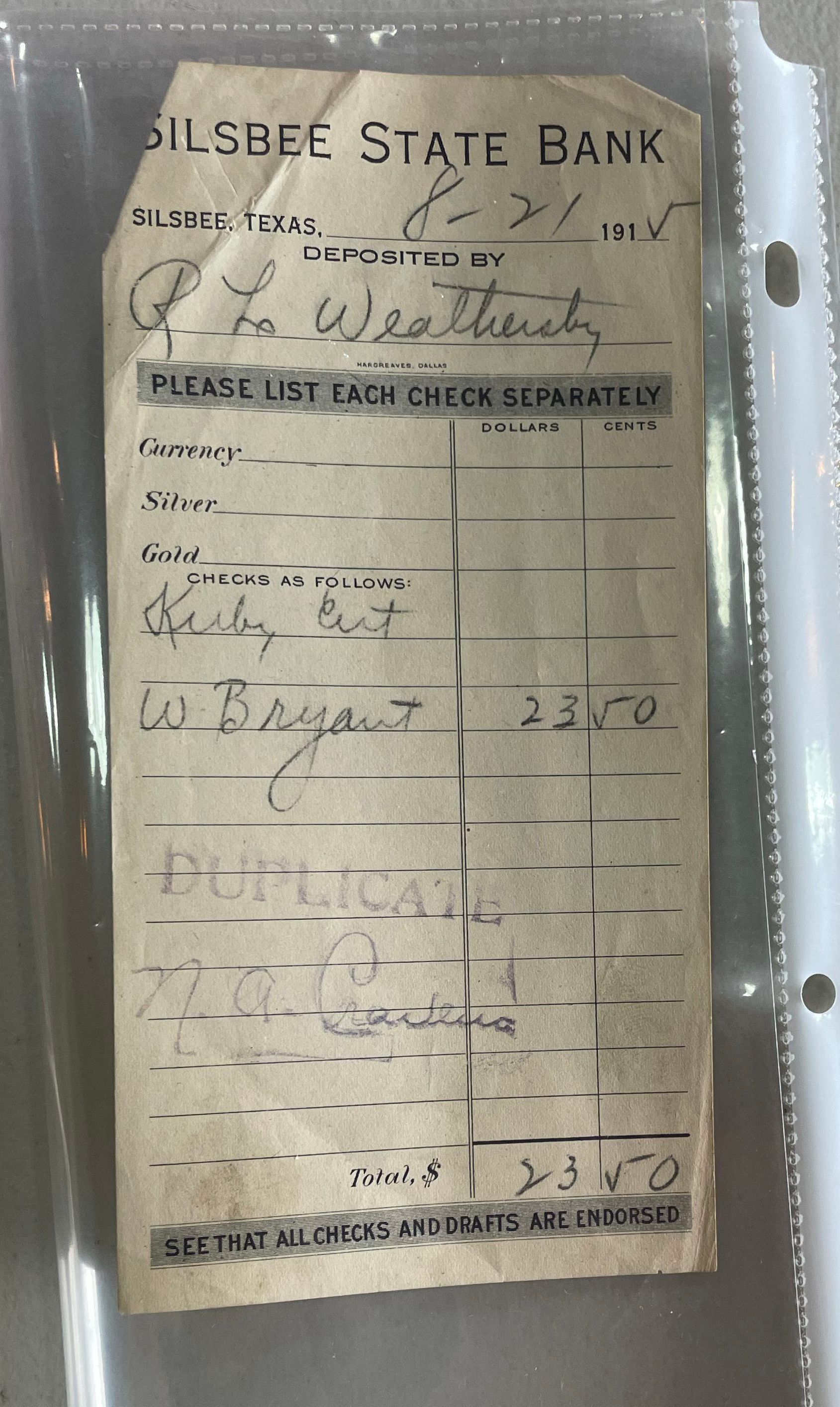 Silsbee State Bank Deposit Slip August 21, 1915