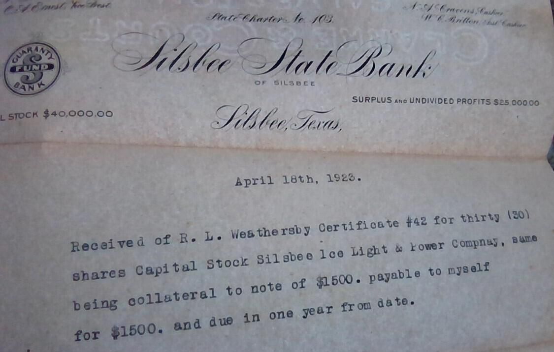 Silsbee State Bank Receipt for R.L.Weathersby Certificate #42, April 18th, 1923Tags