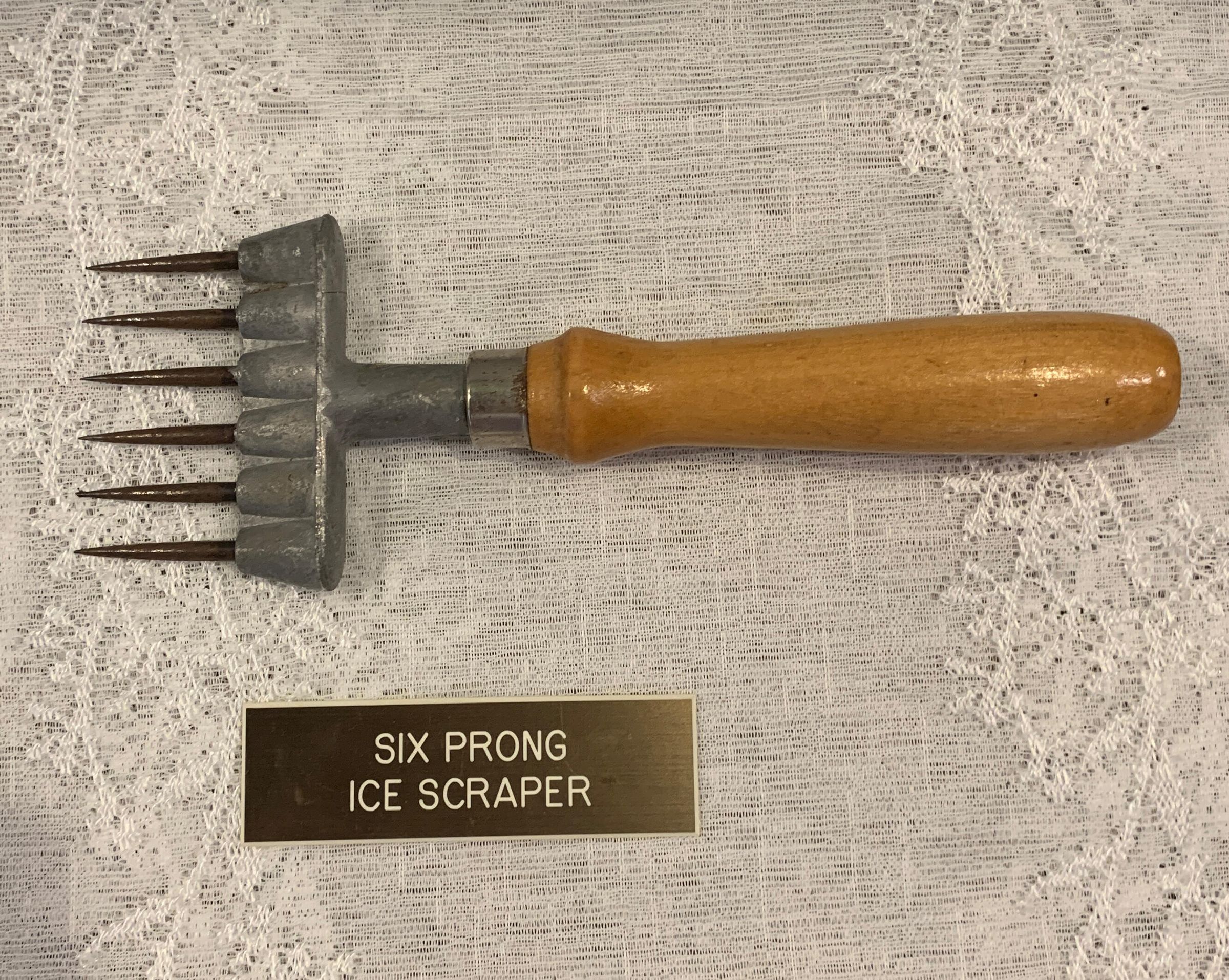 Vintage six prong , wooden handle ice scraper. It was in the Ice Museum 2021 inventory.Use