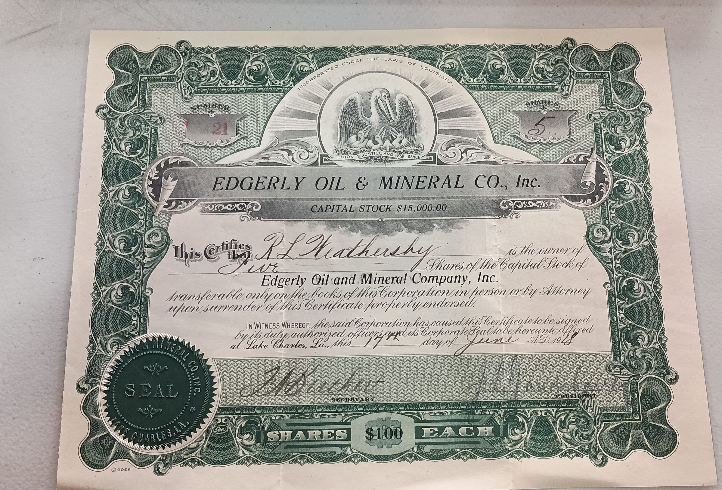 Stock certificate from Edgerly Oil & Mineral for $15,000 of shares dated June 17, 1918Tags
