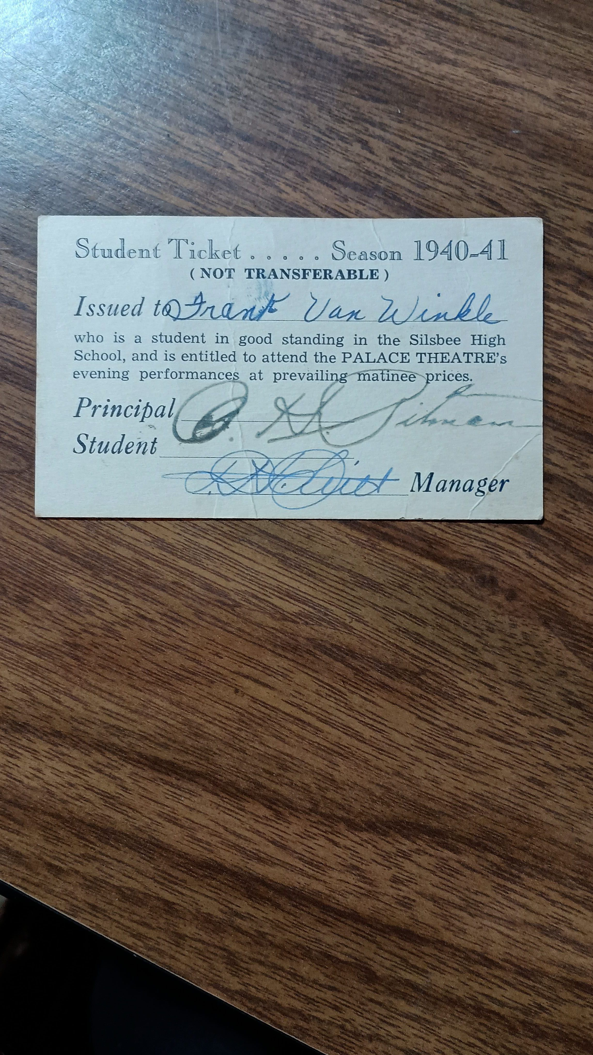 Student Ticket issued to Frank Van Winkle, student in good standing at Silsbee High School to attend Palace Theatre's evening performances at prevailing matinee prices for Season 1940-1941Tags