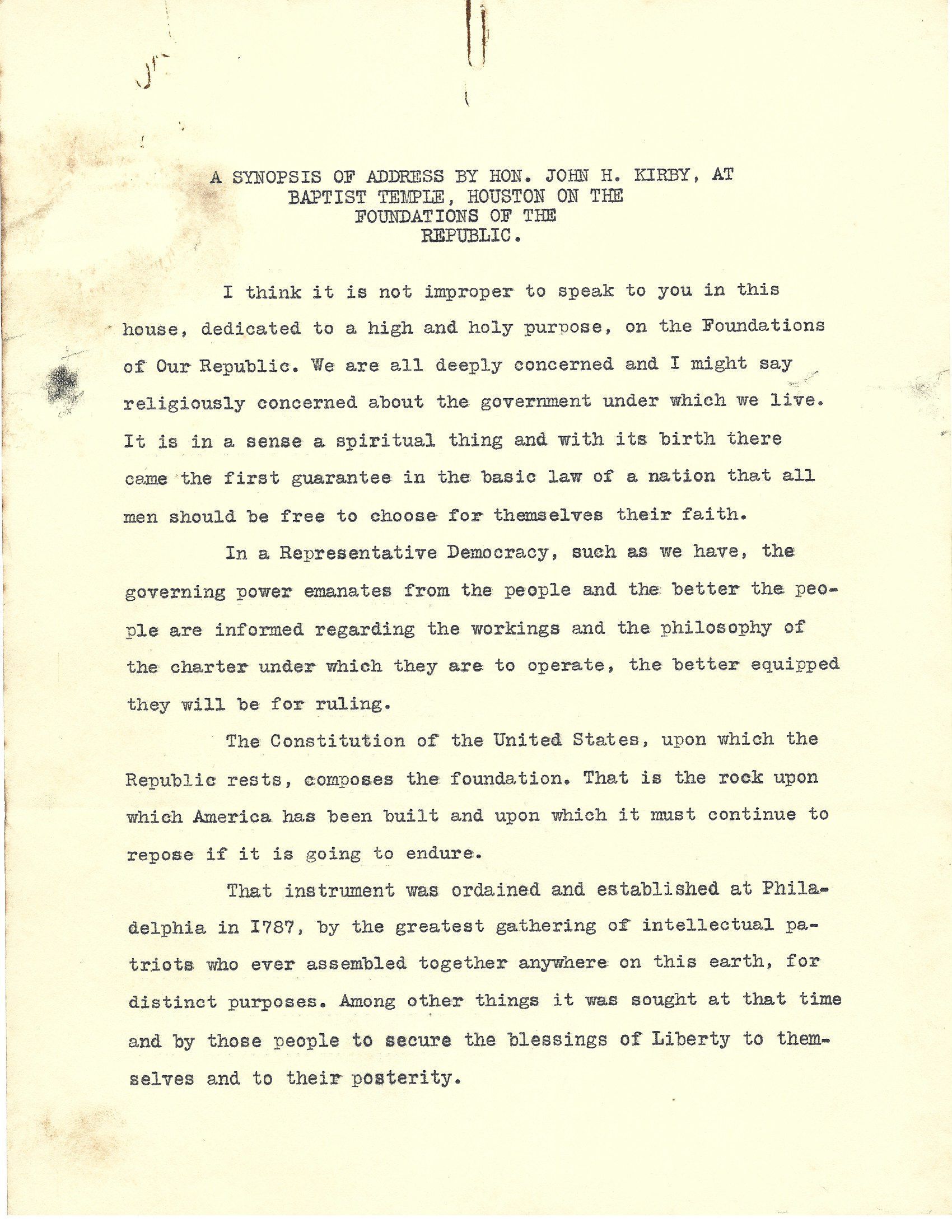 Synopsis of Address by John H Kirby at Baptist Temple, Houston on "The Foundation of the Republic"Tags