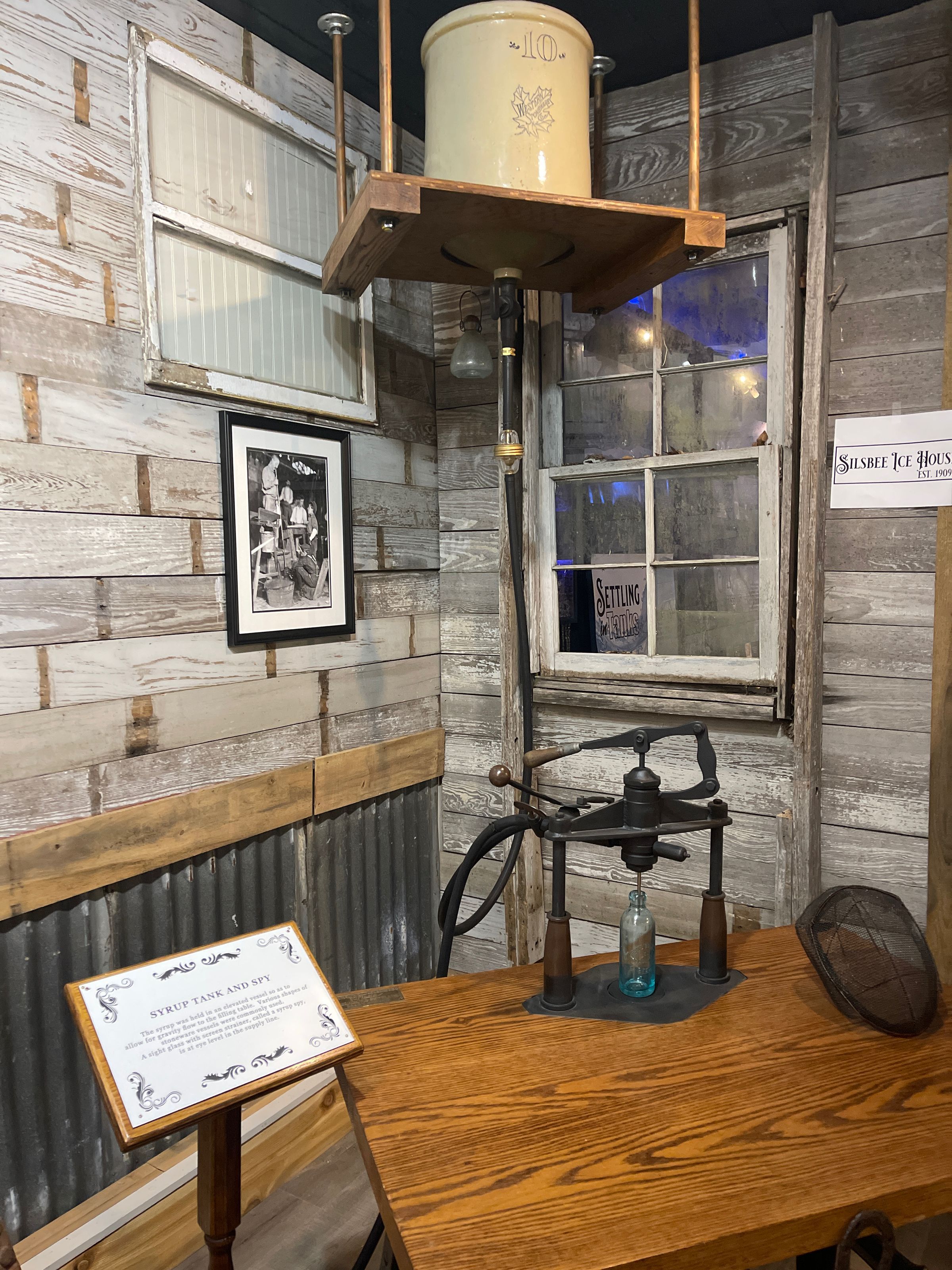 The syrup was held in an elevated vessel so as to allow for gravity flow to the filling table. A sight glass with a screen strainer, called a syrup soy, is at rye level in the supply line.Use