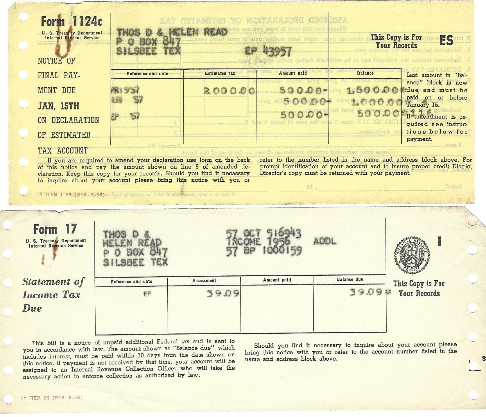 Tax Documents for David & Helen Read 1957