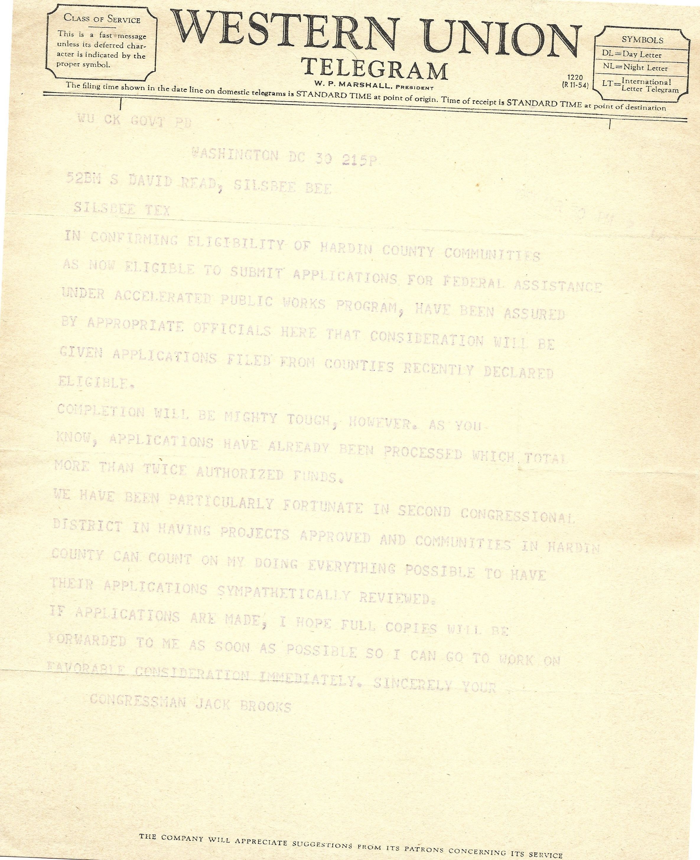 David Read, Jack Brooks, Accelerated Public Works, Hardin County, US House of RepresentativesCreated By