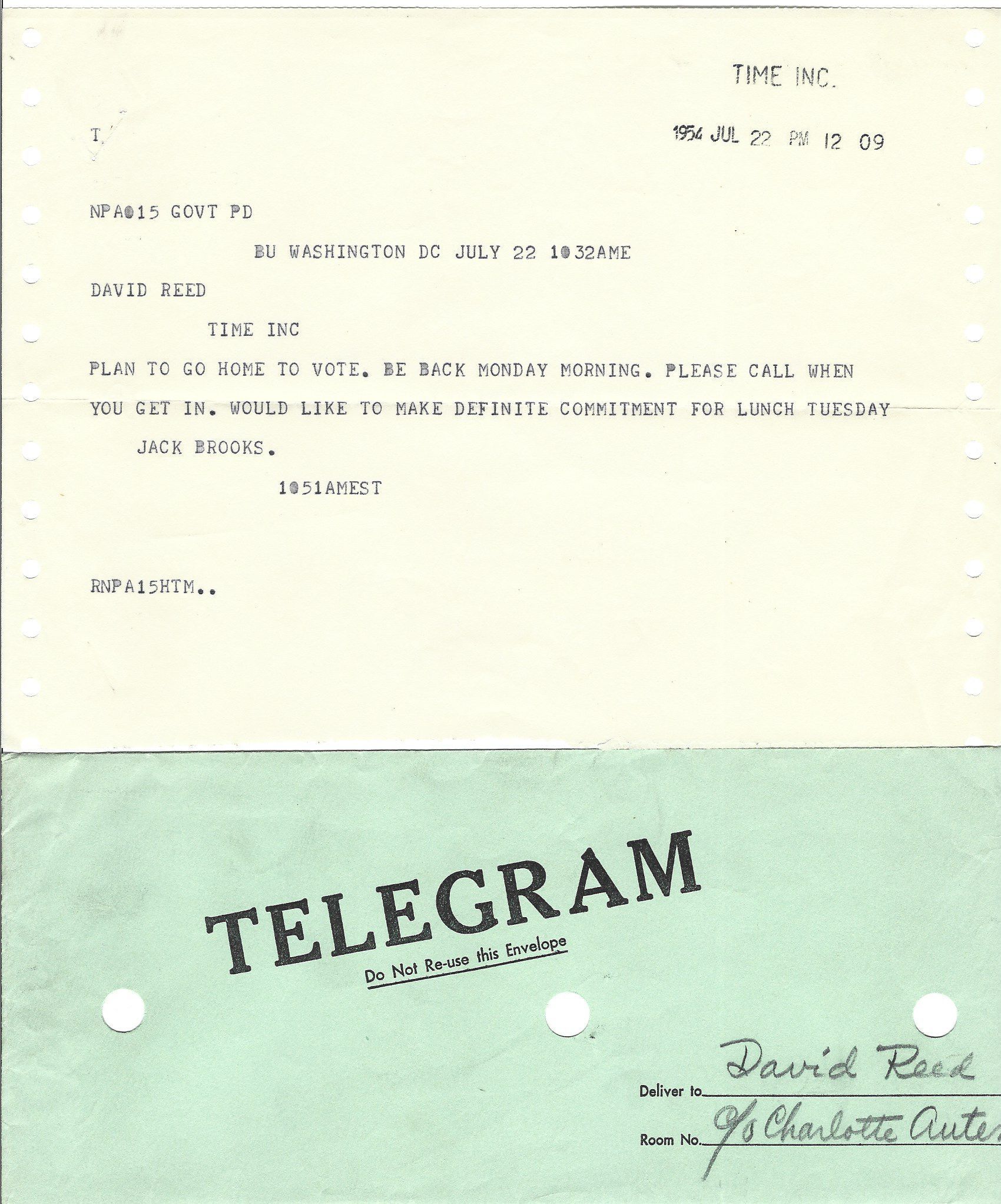 Telegram to David Read from Jack Brooks July 22, 1954 with envelopeTags