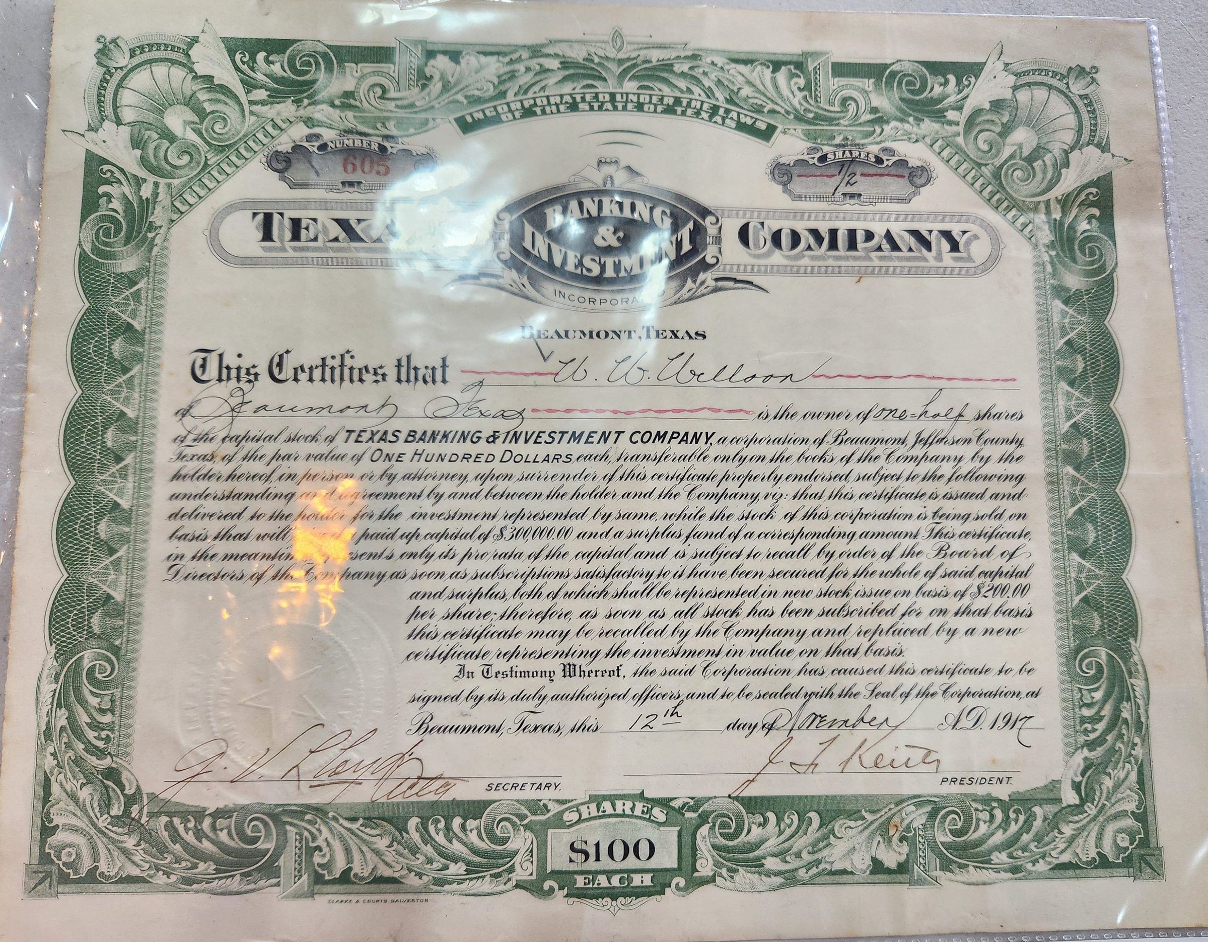 Texas Banking & Investment Co Capital Stock issued to W W Wilson November 12,1916Tags
