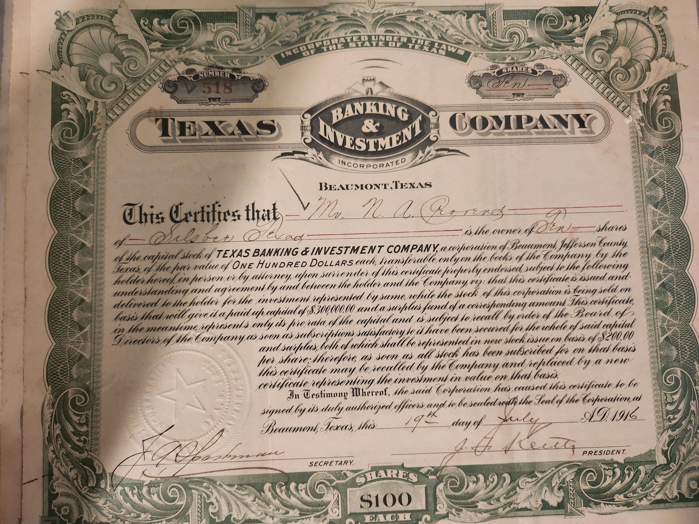 Texas Banking & Investment Company Capital Stock issued to Mr N A Cravens - $100Tags