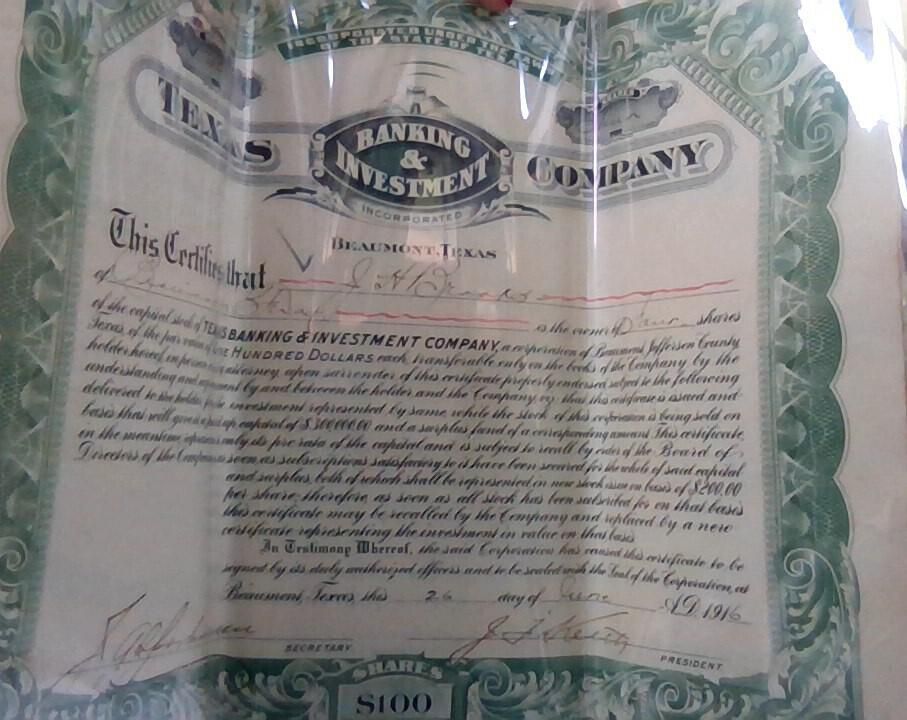 Texas Banking & Investment Company Captial Stock issued to J H Brooks - $100Tags