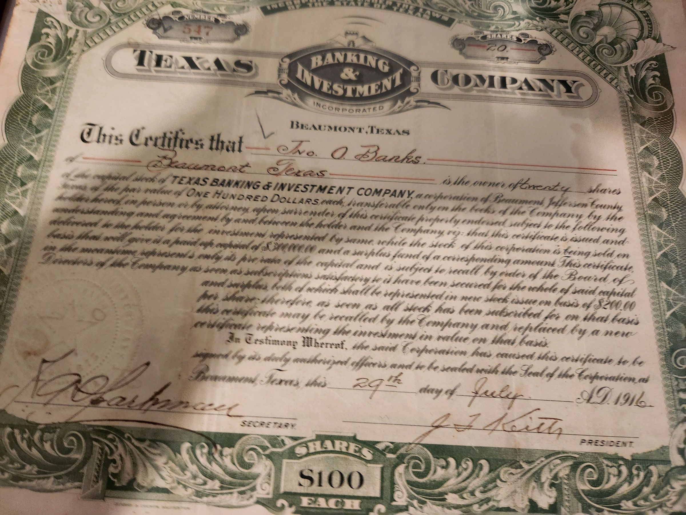 Texas Banking & Investment Company Captial Stock issued to Jno O Banks - $100Tags
