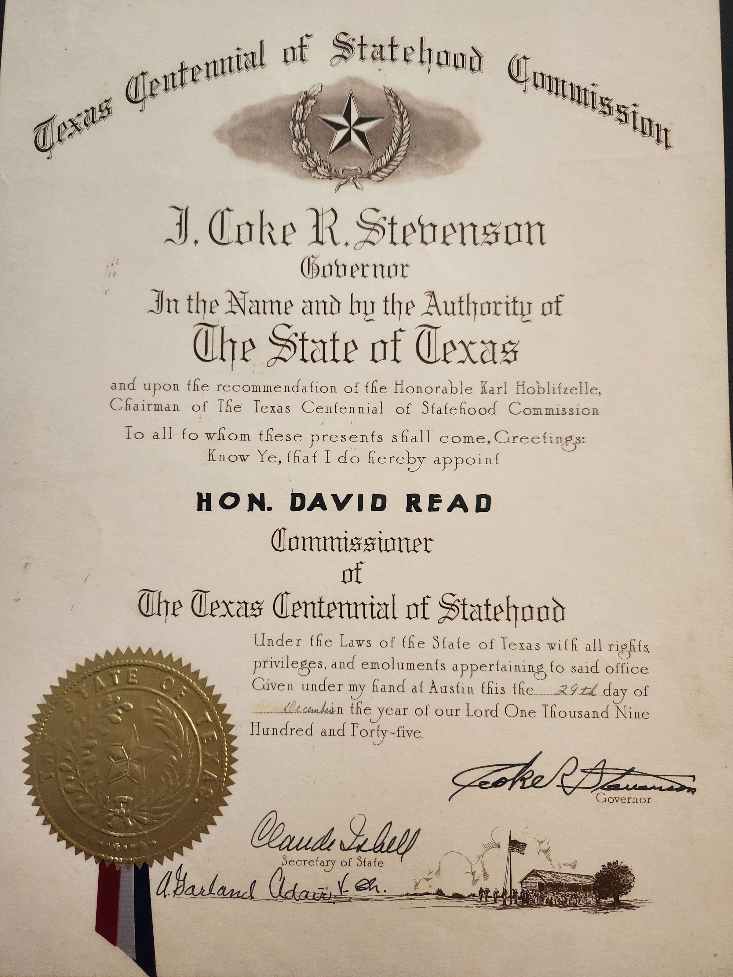Texas Centennial of Statehood Commission - David Read Commissioner December 29, 1945Tags