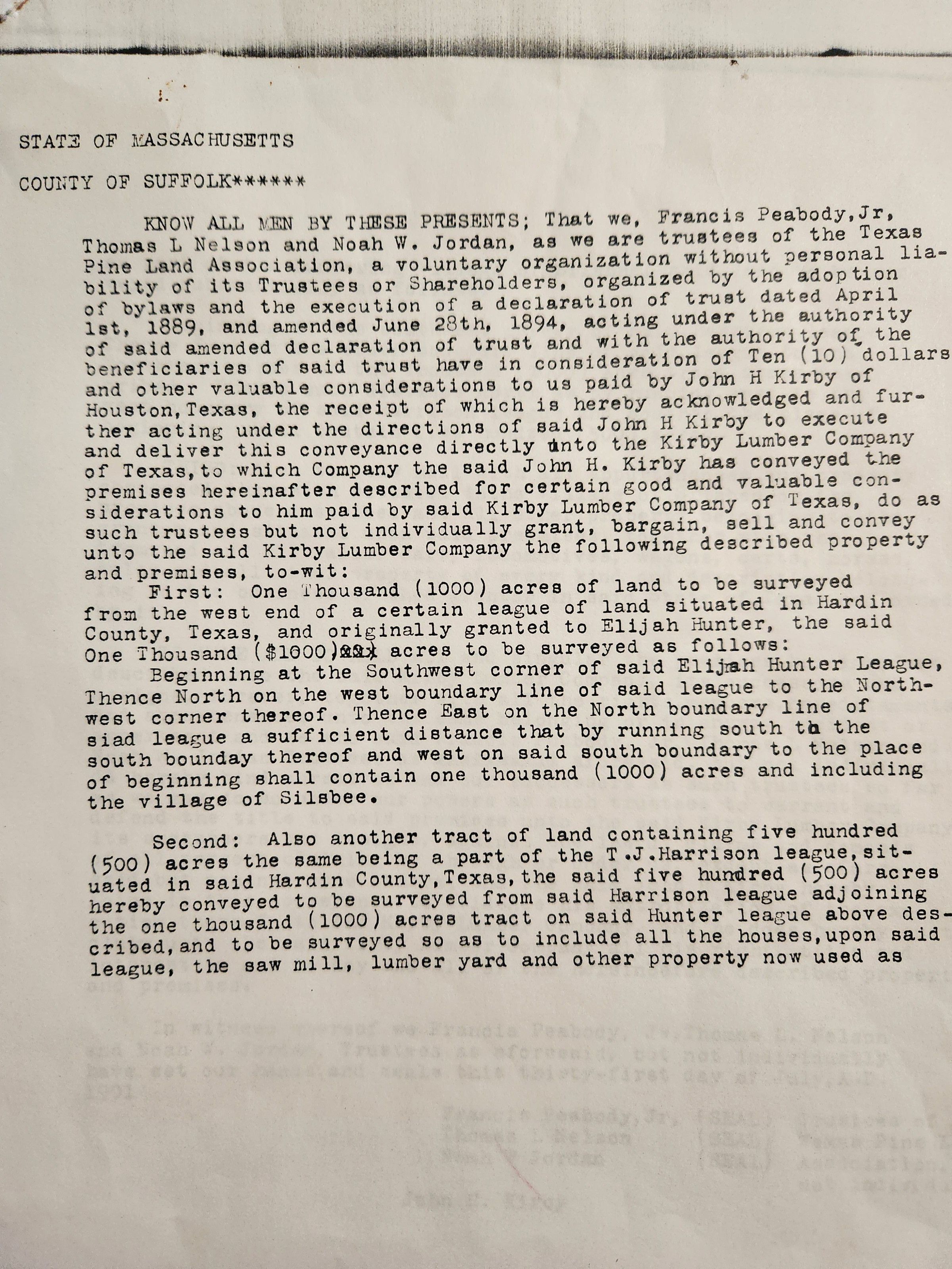 Texas Pineland Association Sale of Land in Hardin County, Texas to John Henry Kirby - August 31, 1901 - Land to become Town of SilsbeeTags