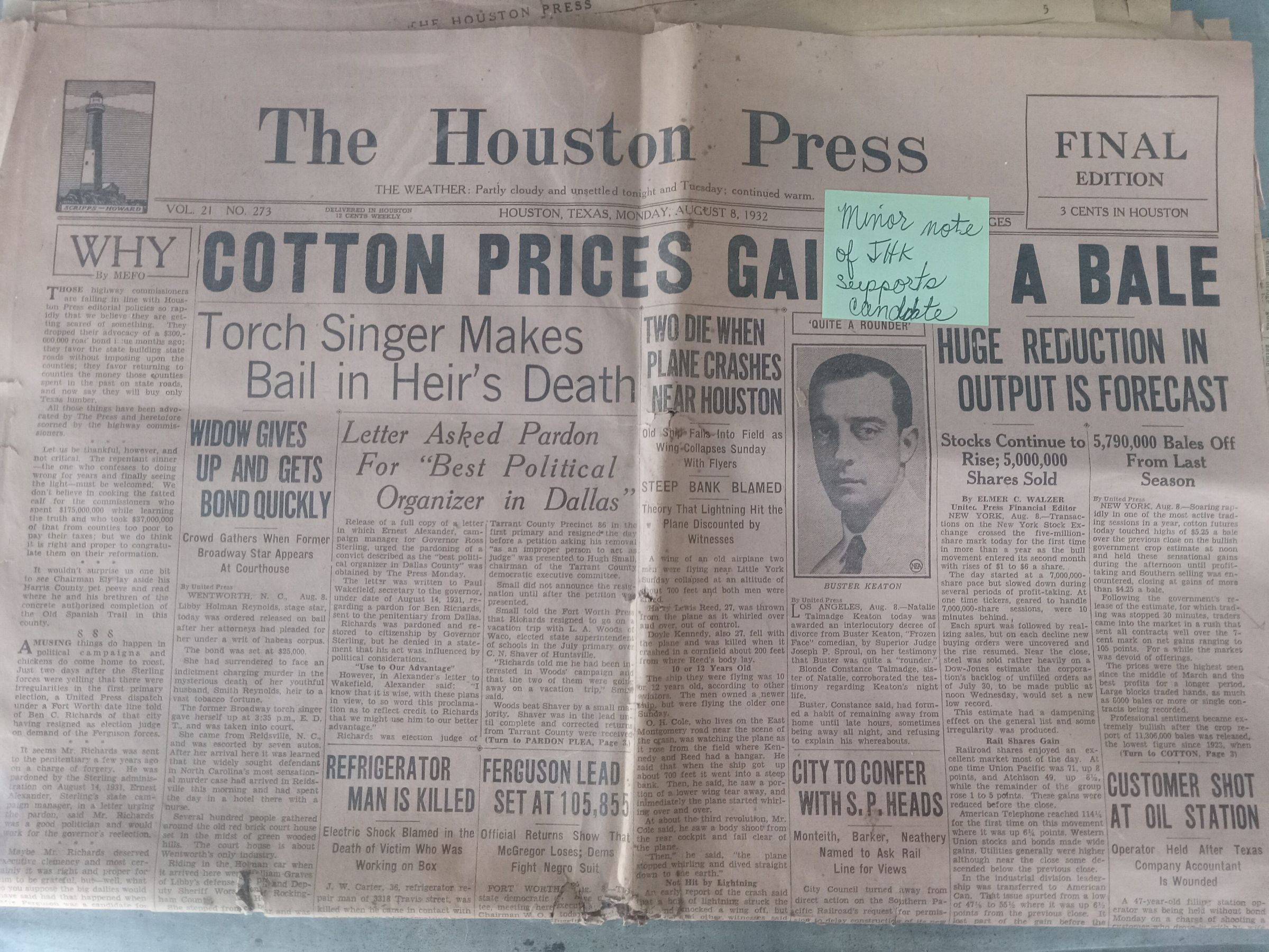 The Houston Press 8/8/1932 -"Cotton prices gain $4 a bail"