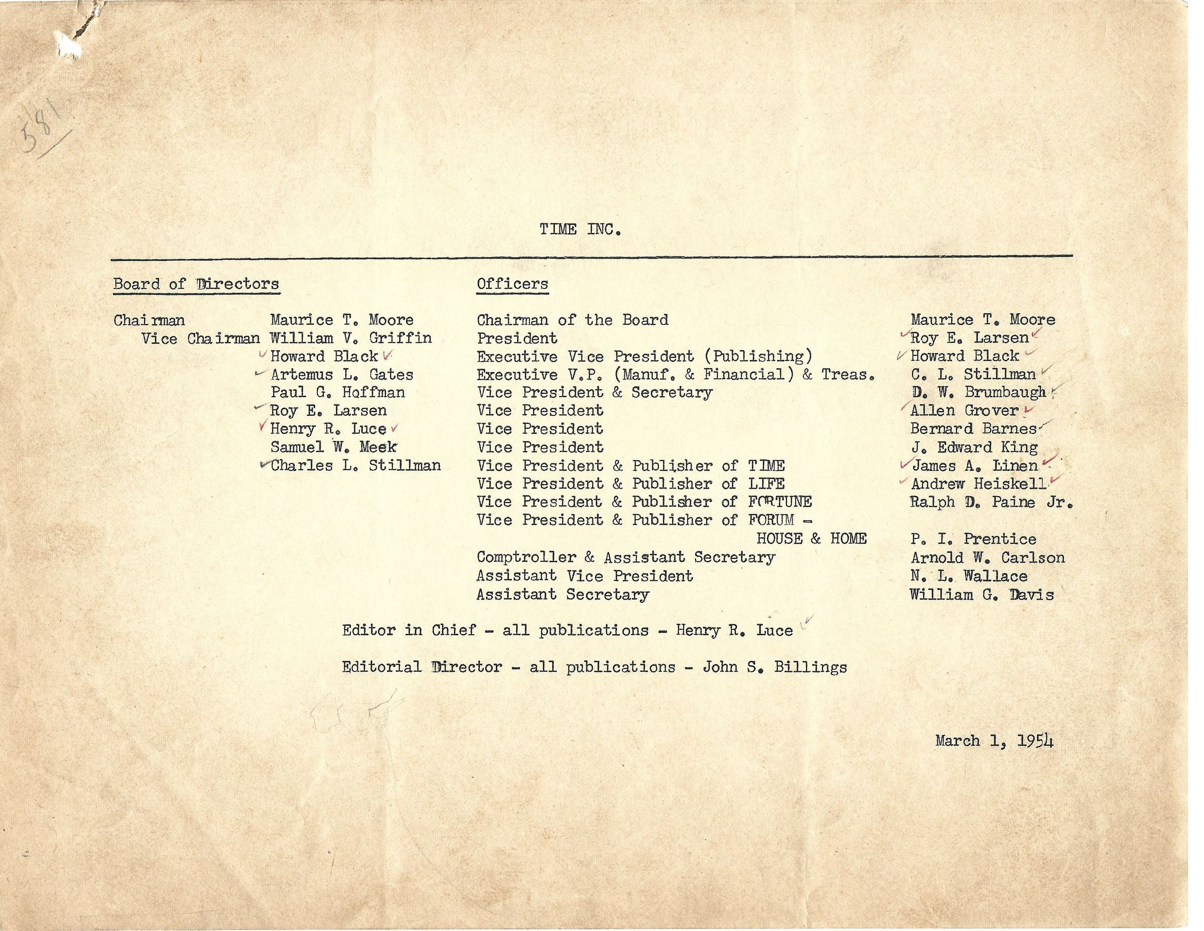 Time Inc Board of Directors and Employee Listing March 1, 1954 - David Read MaterialsTags