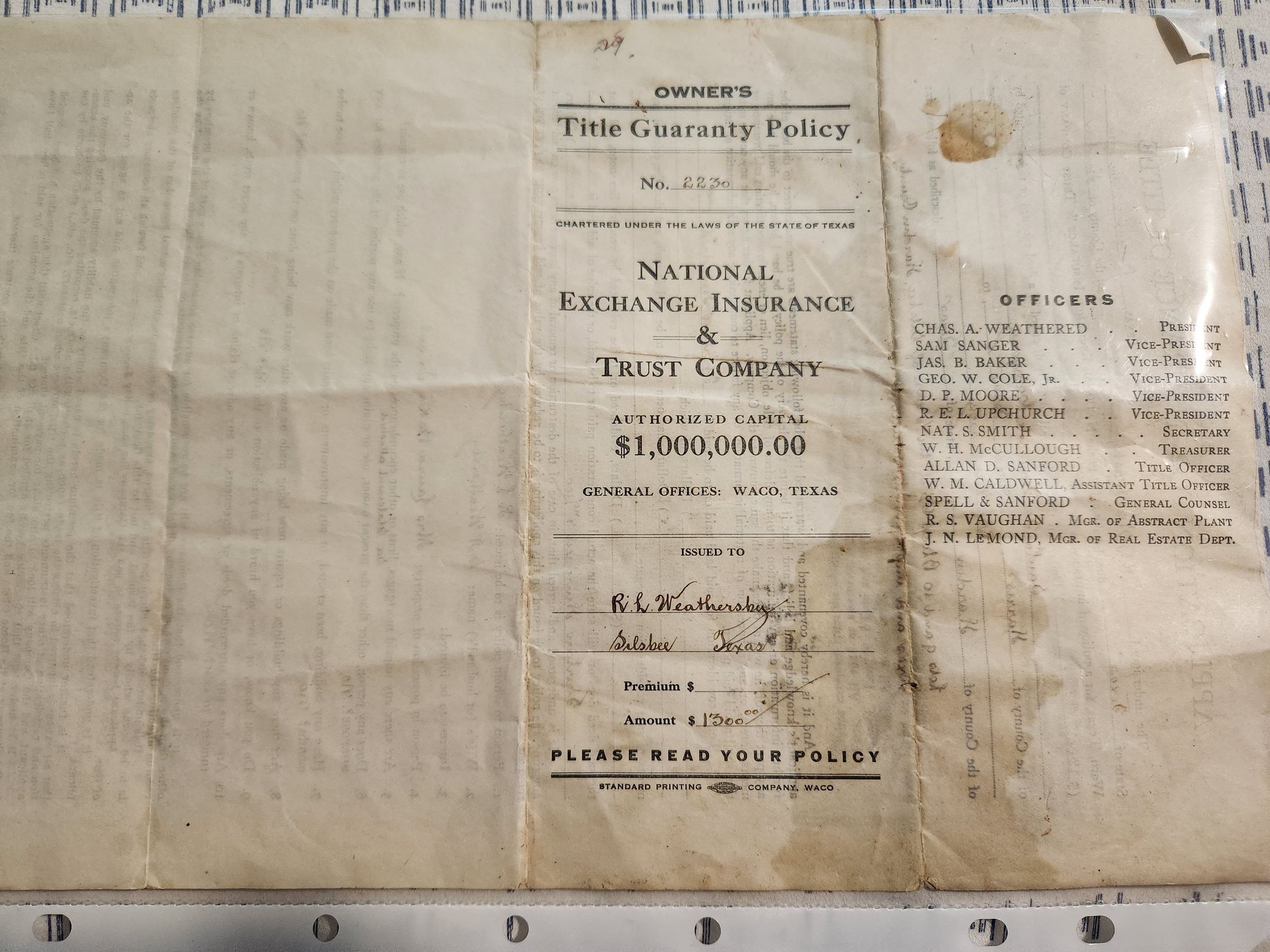 Title Guaranty Policy issued to R L Weathersby Silsbee Tx #2230Tags