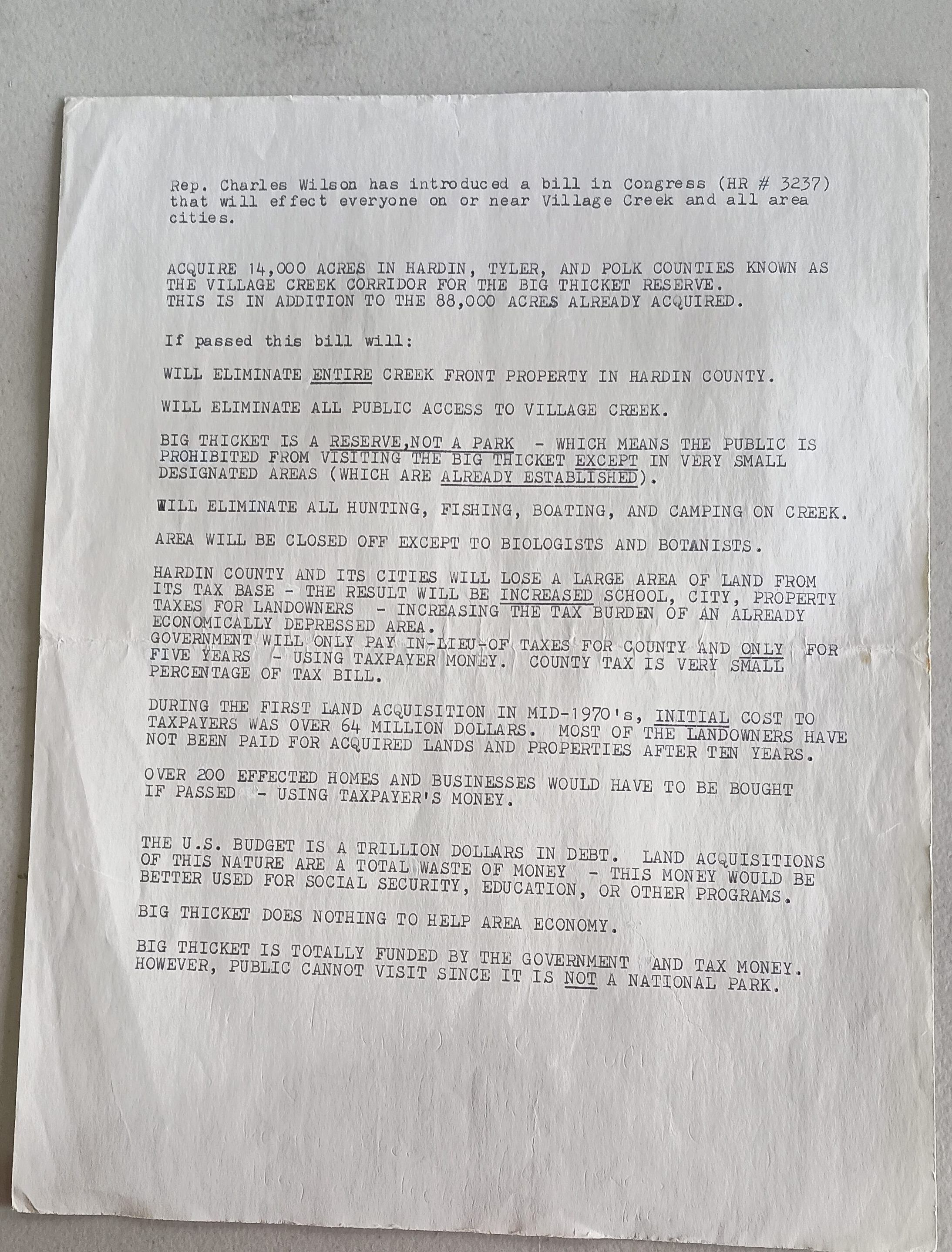 Typed document discussing Rep. Charles Wilson introducing bill 3237 to Congress regarding Village CreekTags