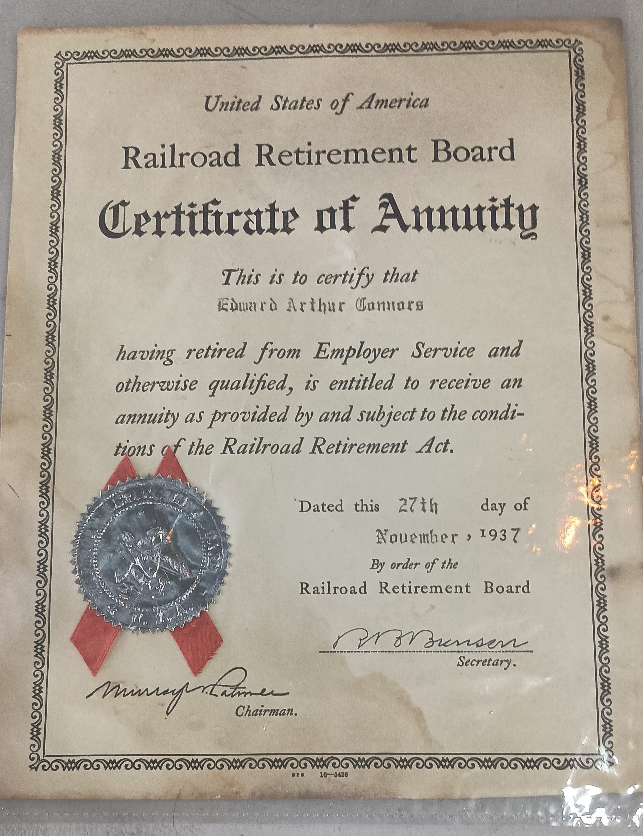USA Railroad Retirement Board Certificate of Annuity for Edward Arthur Connors dated November 1937Tags