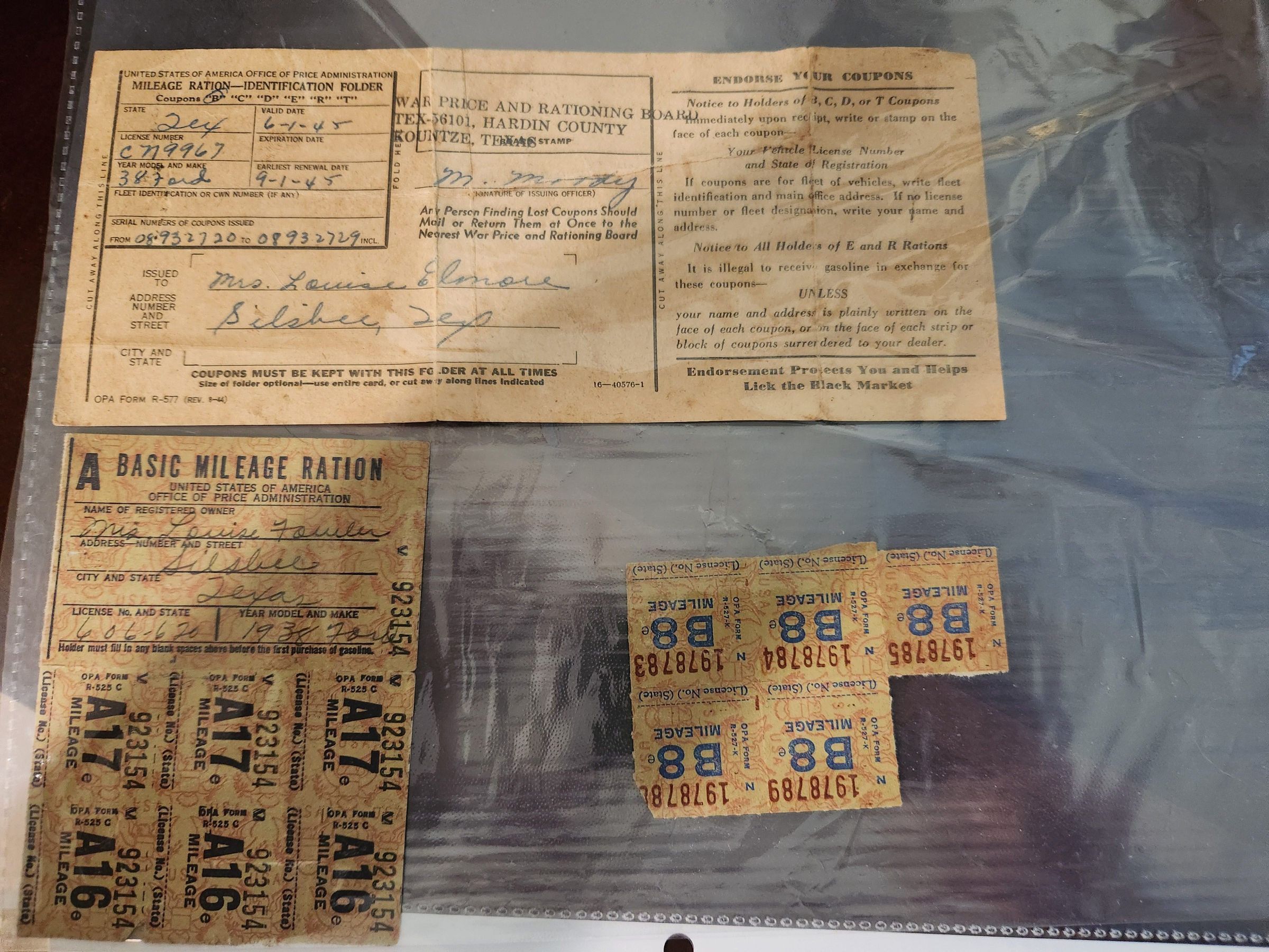 War Mileage Ration Book for Mrs Louise Elmore and Coupons 1945