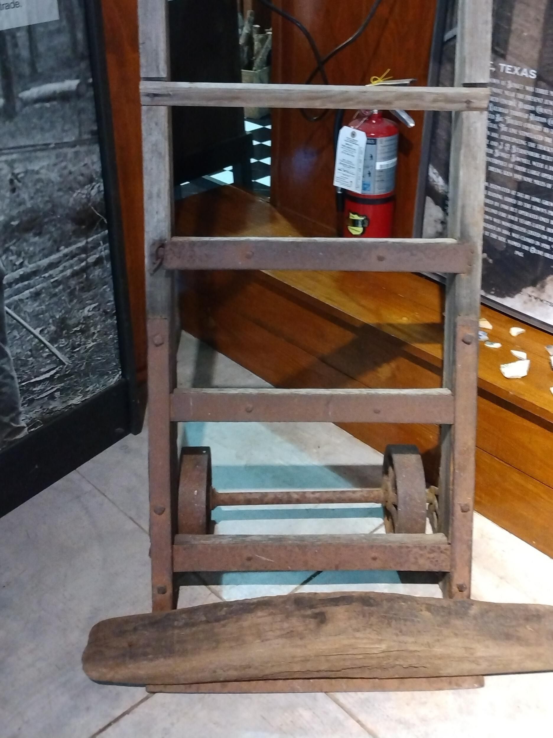 This two-wheel wood and metal dolly was owned by John Henry Kirby Lumber Company in 1895.Cataloged By