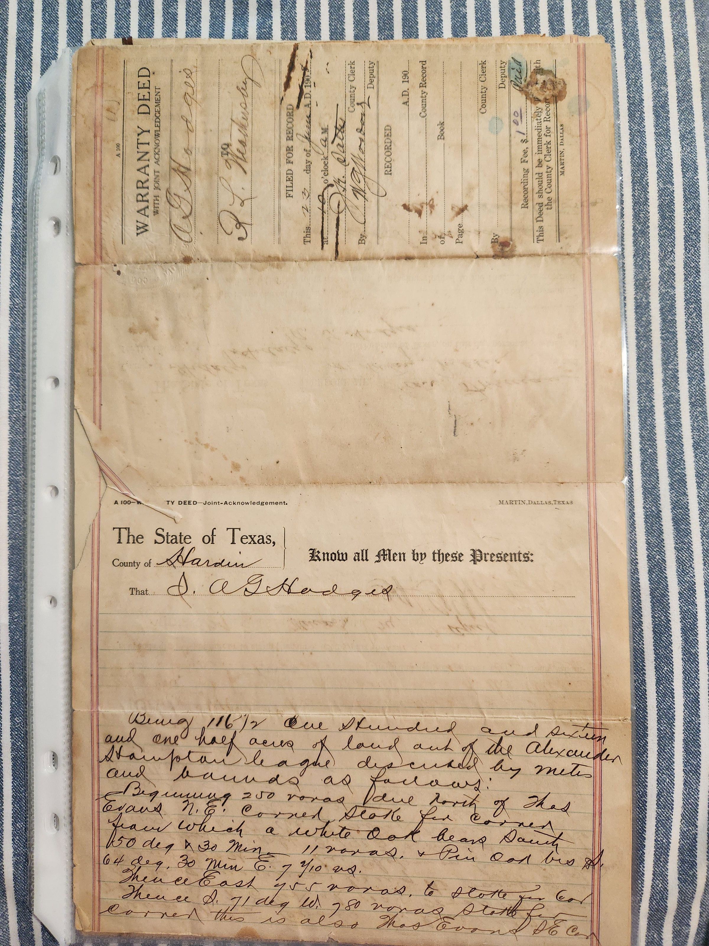 Warranty Deed from A G Hodges to R L Weathersby dated June 23, 1908 for landTags