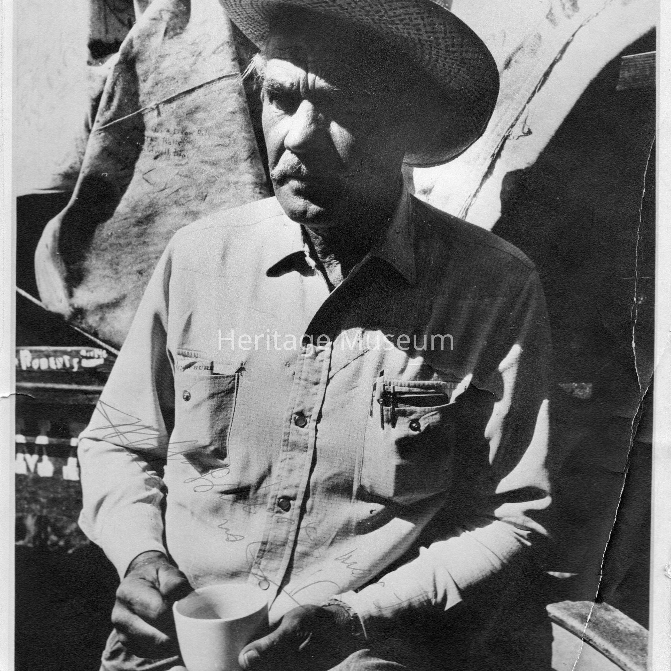 Ben Griffith wearing a straw hat, holds a cup of coffee while sitting outdoors near a Cavalcade wagon