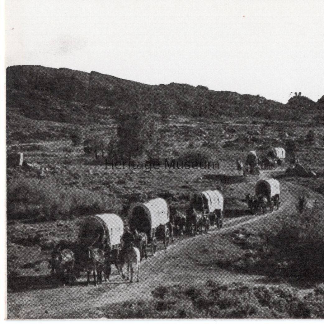 A line of covered wagons travels along a winding road through a rugged, hilly landscape.