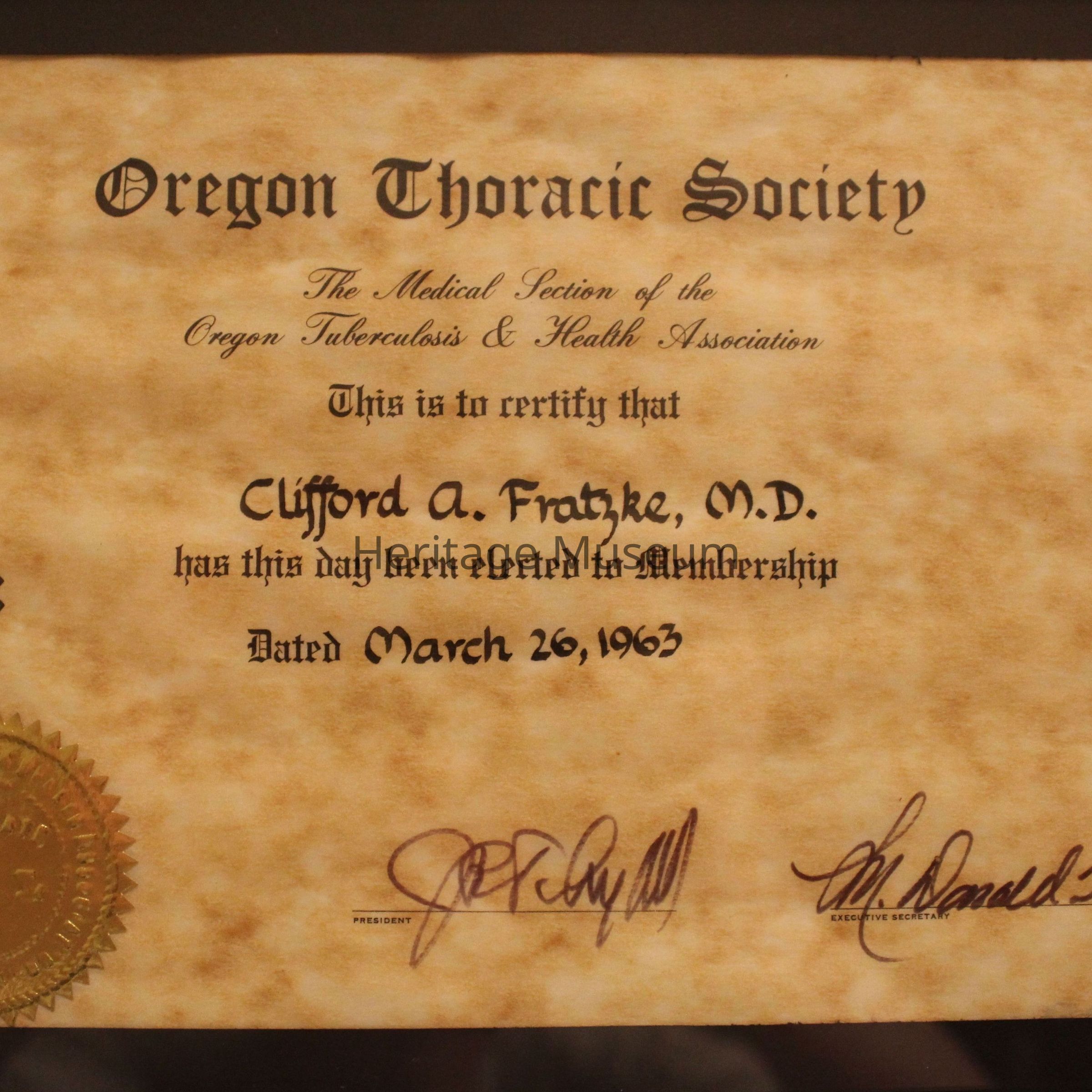Certificate to Oregon Thoracic Society