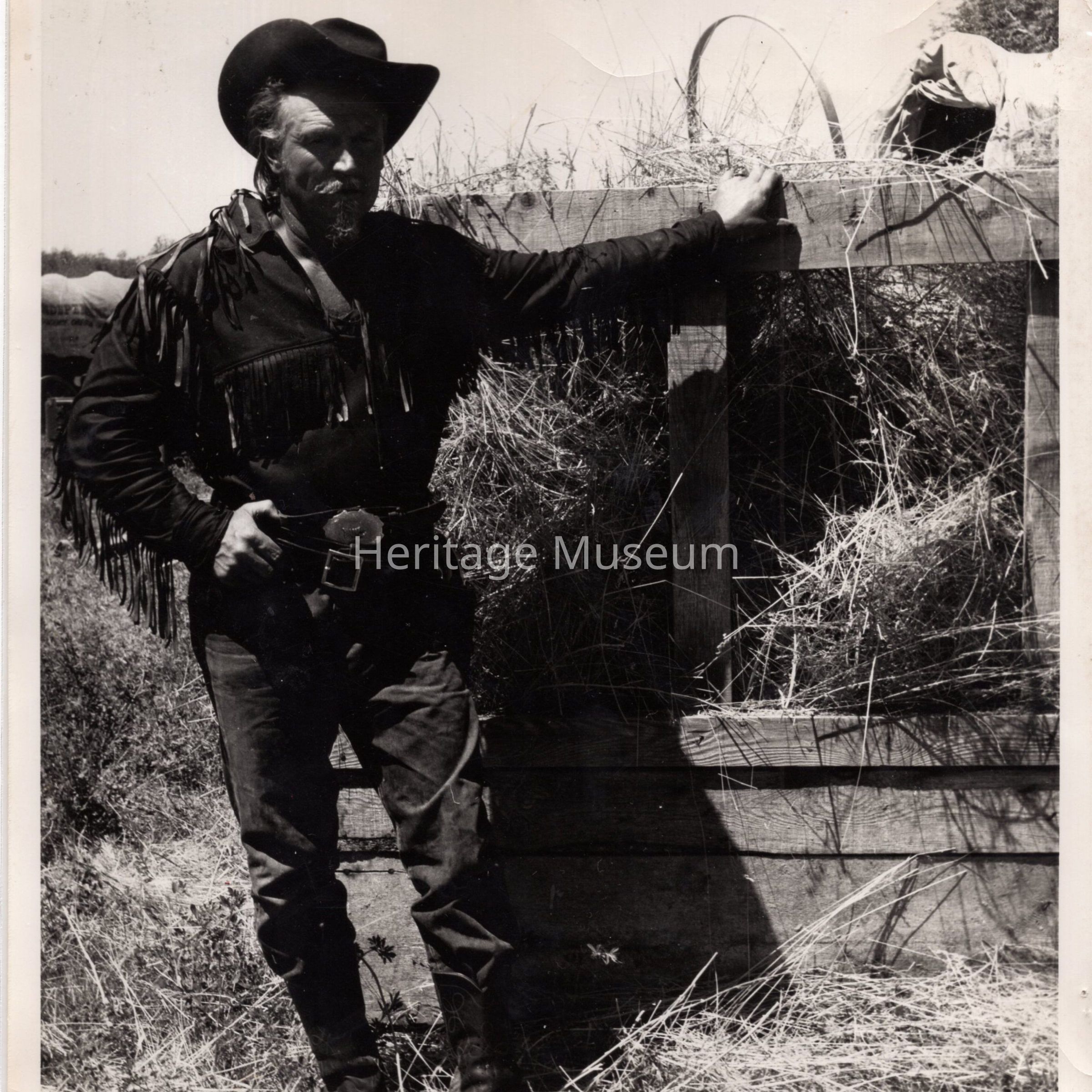 Dave Gastman in fringed attire leans on a hay-filled wooden fence, wearing a hat.
